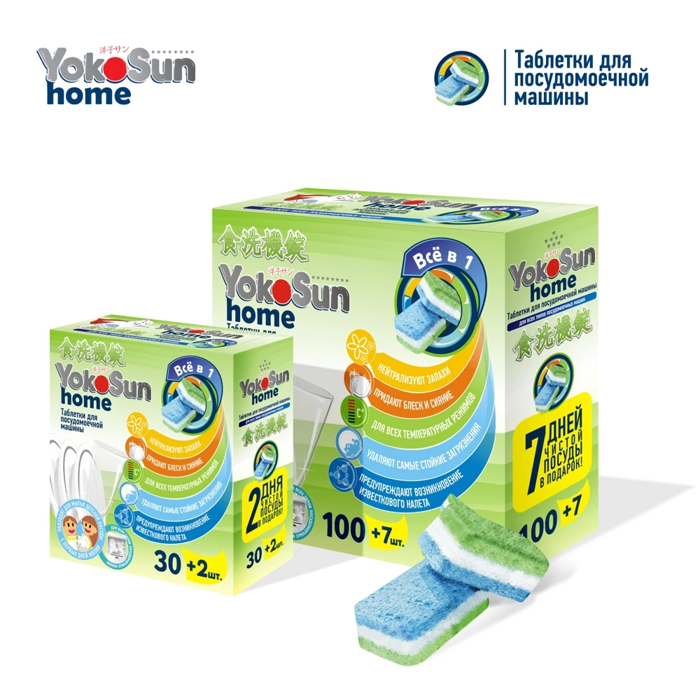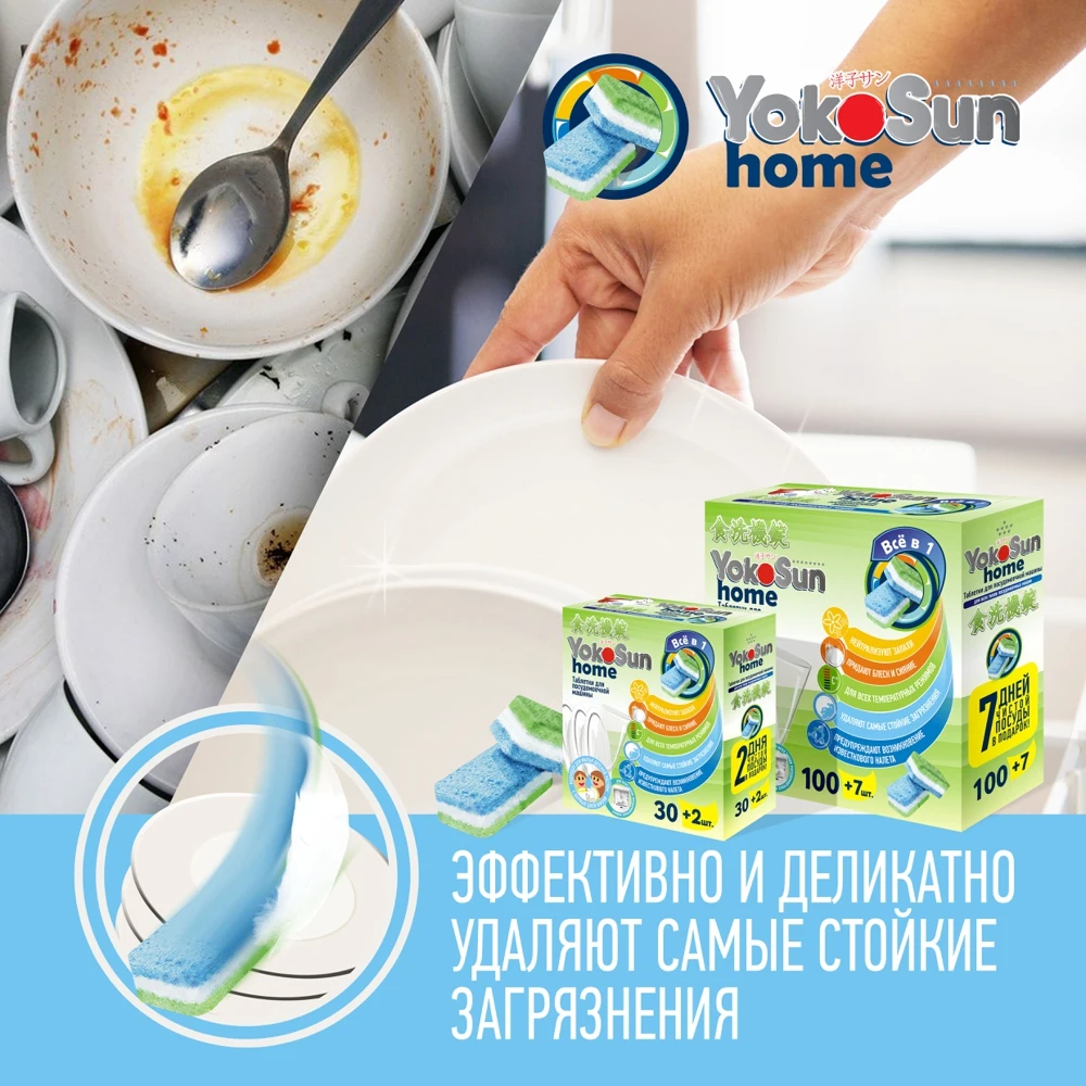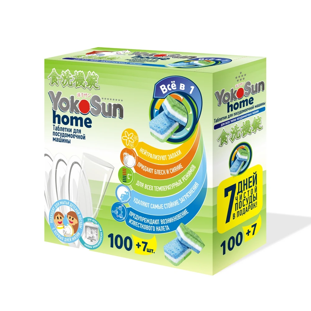 Таблетки для посудомоечной машины YokoSun специально разработаны для домашних посудомоечных машин всех типов.