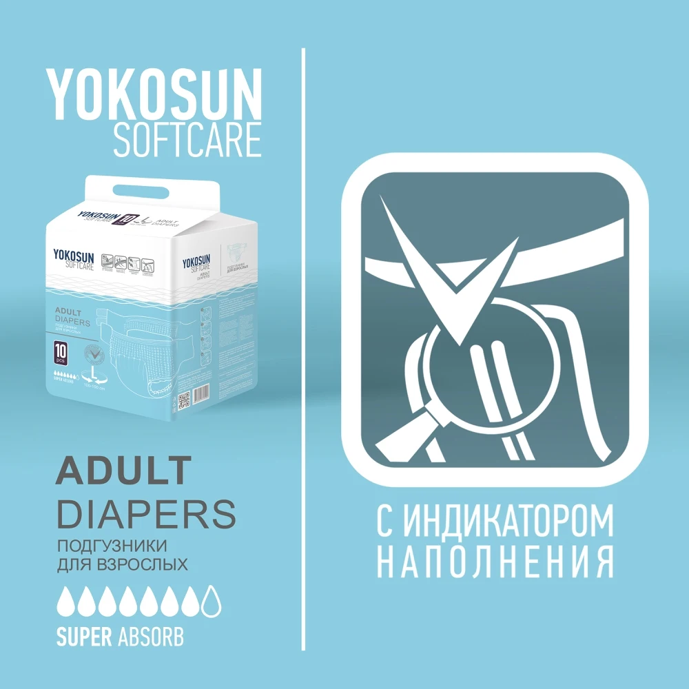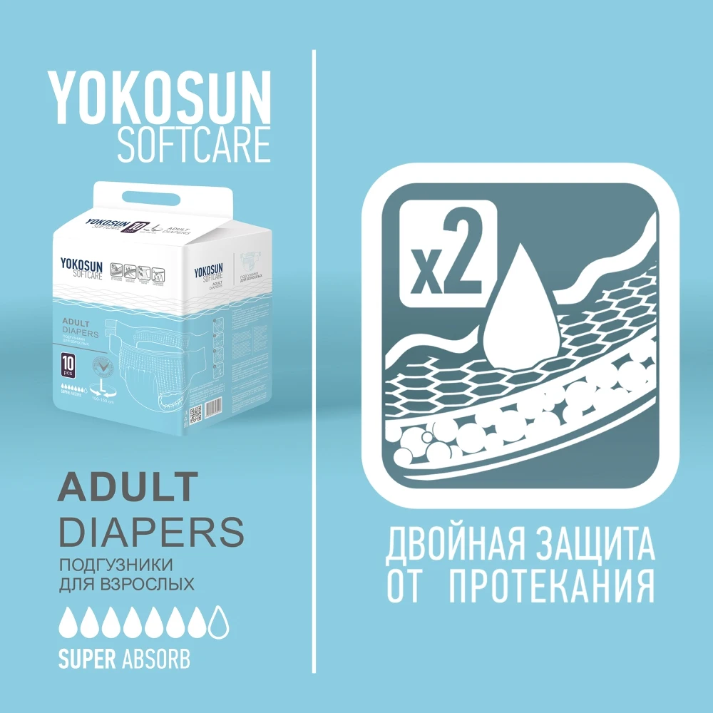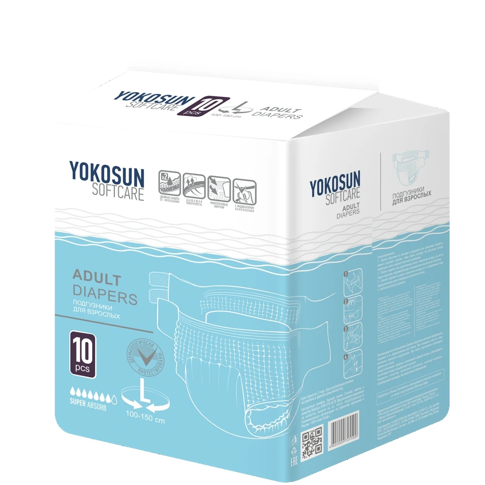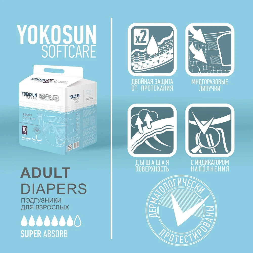 Подгузники на липучках YokoSun для взрослых – новые дышащие подгузники для взрослых, предназначенные для активных людей и лежачих больных со средней и тяжелой степенью недержания мочи. Изготовлены из экологически чистых материалов без использования химических отбеливателей и парфюмерных отдушек. Гипоаллергенны, дерматологически протестированы.