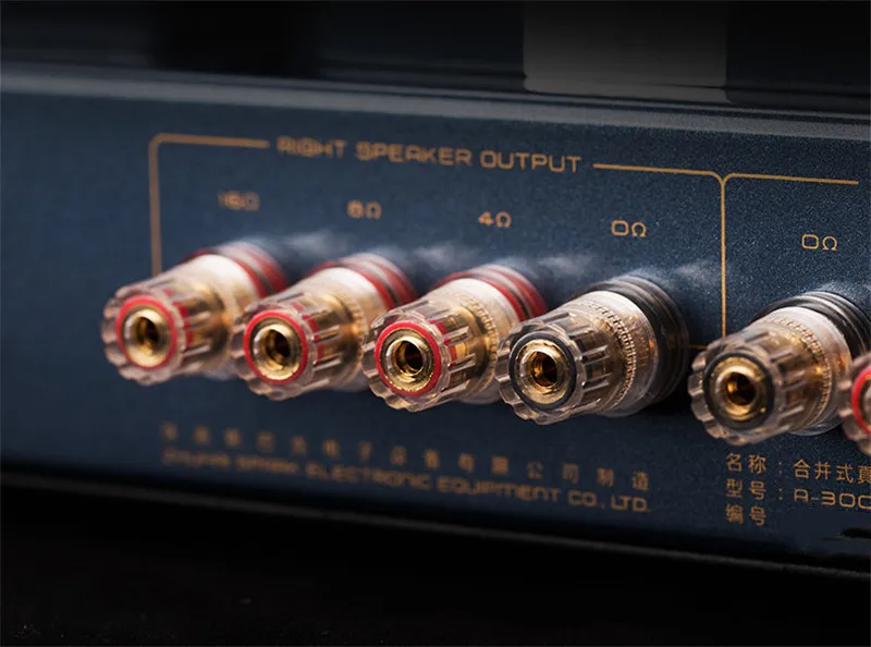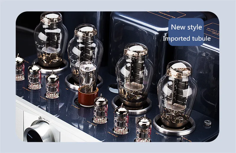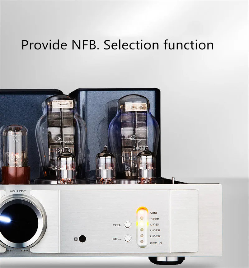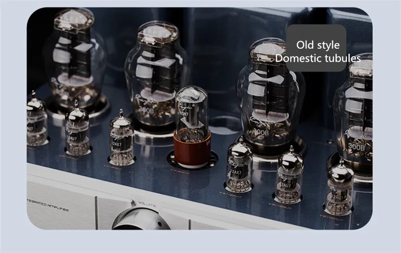 Этап усилителя предварительного напряжения питается от вакуумной трубки 6SN7 система стабилизации напряжения. Усилитель напряжения и бустерные этапы используют вакуумные трубки 12AX7 и 12AU7, импортированные из Чехии JJ, соответственно. Силовая трубка использует четыре вакуумные трубки 300B для усиления push-тяги чистого класса А.
