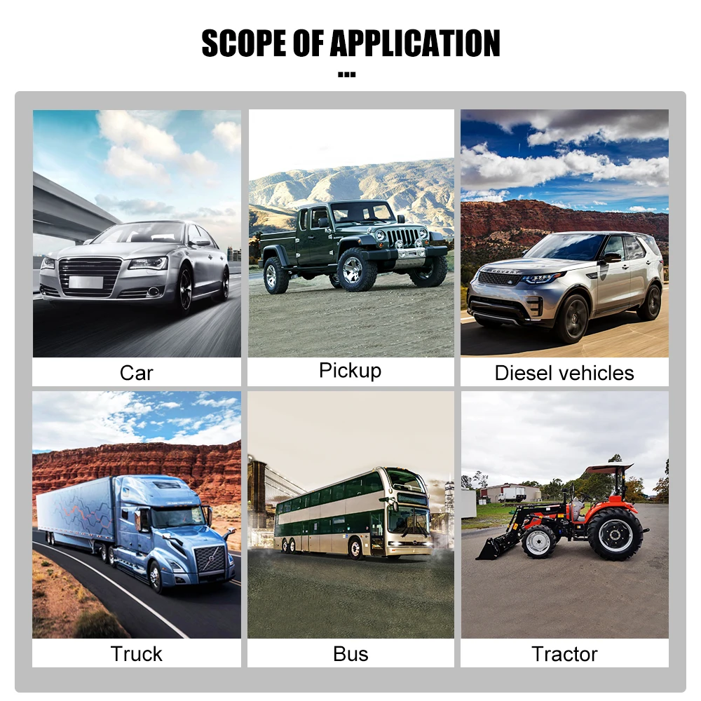 Поддержка автомобилей, пикапов, дизельных автомобилей, грузовиков, автобусов и экскаваторов.