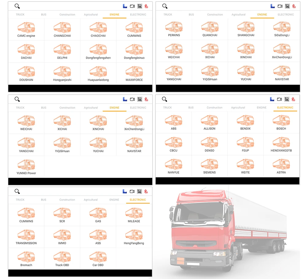 ABS, для ALLISON, для BENDIX, для BOSCH, CBCU, DENSO, FEUP, для HENGYANGDTB, для NANYUE, для SIEMENS, для WEITE, для ASTRA, для CUMMINS, SCR, GAS, пробег, передача, IMMO, ASS, для HengYangBeng, для Bremach, Truck OBD, CAR OBD