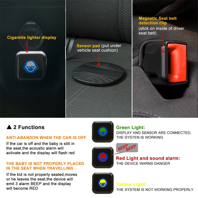 2. Простота в использовании, не нужен смартфон. Хороший помощник для родителей, чтобы держать детей в безопасности во время вождения автомобиля и предотвратить случайное забывание вашего ребенка в carThe будильник будет срабатывать, когда вы разблокируете пряжку ремня безопасности или выключите автомобиль ACC когда у вас есть ребенок или ребенок на заднем сиденье.
