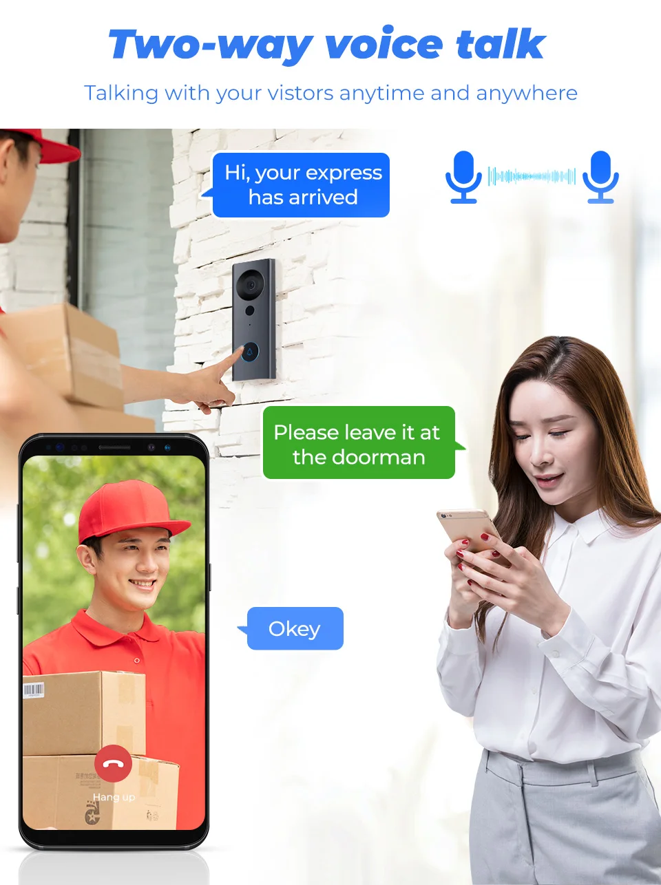 -Встроенный микрофон и динамик, поддерживает видео в реальном времени, что позволяет вам общаться с вашим посетителем в реальном времени, где бы вы ни находились.