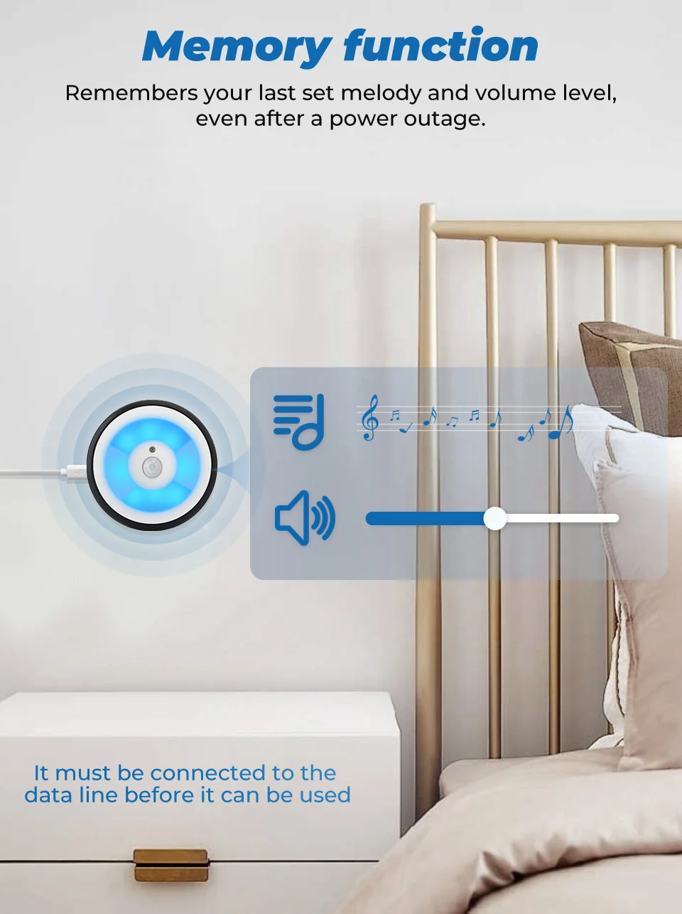 Запоминает Вашу последнюю мелодию и уровень громкости даже после отключения питания.