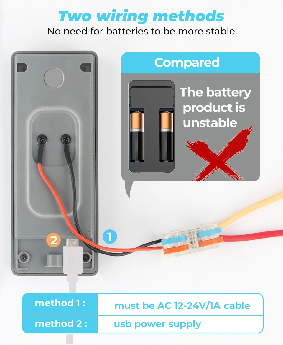 1. Дверной звонок Wi-Fi поддерживает источник питания AC12 ~ 24 В: не нужно беспокоиться об отсутствии заряда батареи, информация о нажиме на мобильный телефон стабильная, и ее можно контролировать в течение 24 часов. Остальные маломощные продукты часто не имеют мощности