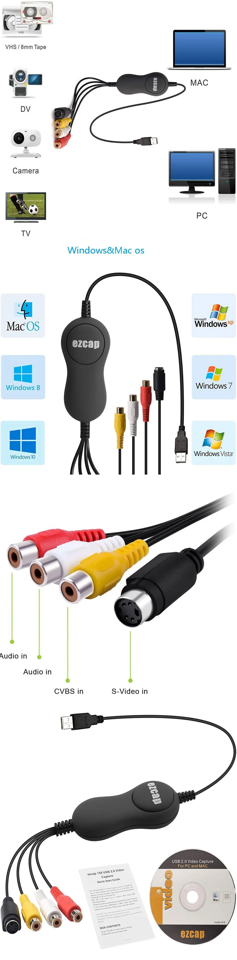 Подключи и работай: очень прост в использовании, драйвер не требуется. С одним касанием конвертируйте ваши vhs ленты Hi8 и V8 камеры в цифровой формат, такие как AVI, MPEG2, MPEG4 и MP3 (только аудио) и передача на DVD (Программа записи DVD не включена).