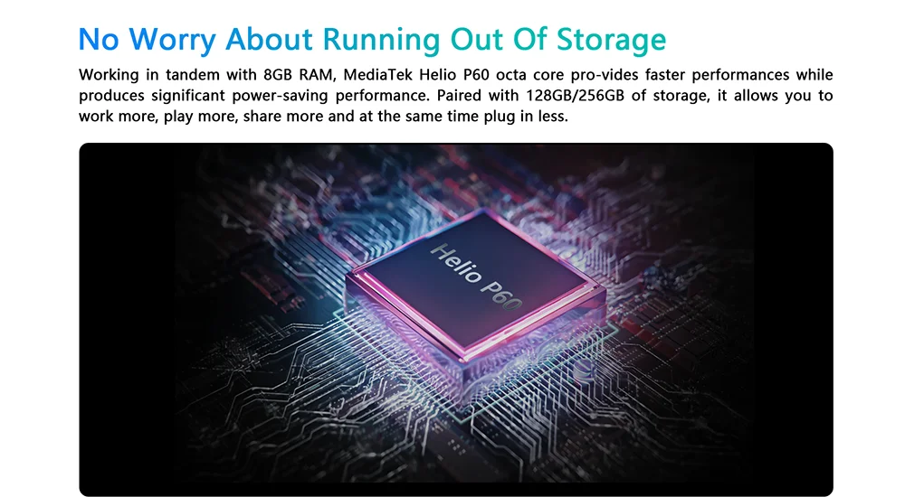 Работает в тандеме с 8 Гб оперативной памяти, Восьмиядерный процессор MediaTek Helio P60 pro-vides обеспечивает более быструю производительность, обеспечивая при этом существенную энергосберегающую производительность. В сочетании с 128 ГБ/256 ГБ памяти, он позволяет работать больше, играть больше, делиться больше и в то же время подключаться меньше.