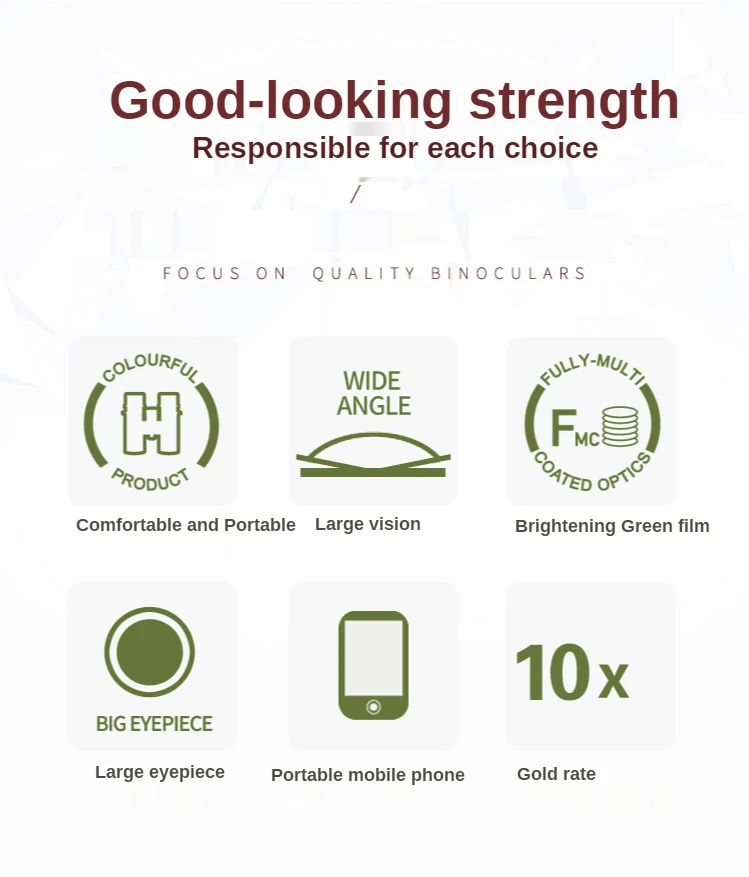 Модель: 10x25 / 2x32 Увеличение: 10x /12x Покрытие: многослойная зеленая пленка FMC Диаметр окуляра: 18 мм/20 мм Диаметр объектива: 25 мм/32 мм Призмовая структура: BAK4 Тип маски для глаз: spin-up маска для глаз Зеркальный Материал корпуса: металлическая структура + Резиновая оболочка Поле зрения угол: 5,2 °/4,5 ° Вес продукта: Нетто 362 г/брутто 711 г Нетто 495 г/брутто 855 г
