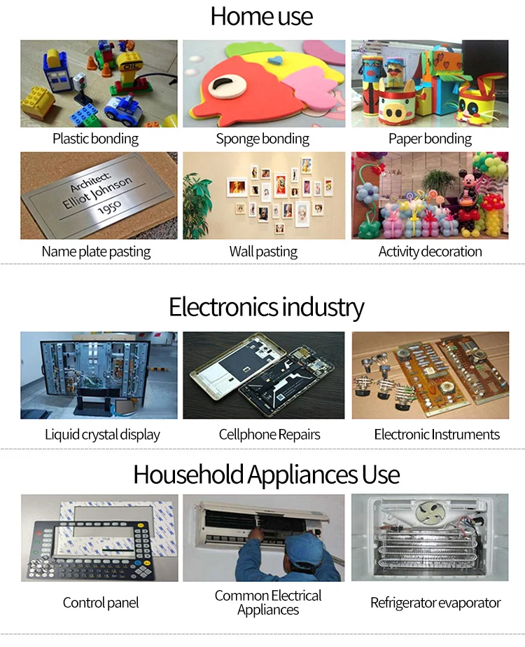 Перерабатывающая промышленность, включая склеивание резиновой ленты и пластика в резиновой и пластиковой промышленности, подходит для склеивания испарителя холодильника и панели управления, таблички, бытовой техники, автомобиля, мобильный телефон, губка, бумажные изделия, игрушки и детали электронных инструментов в сборе.