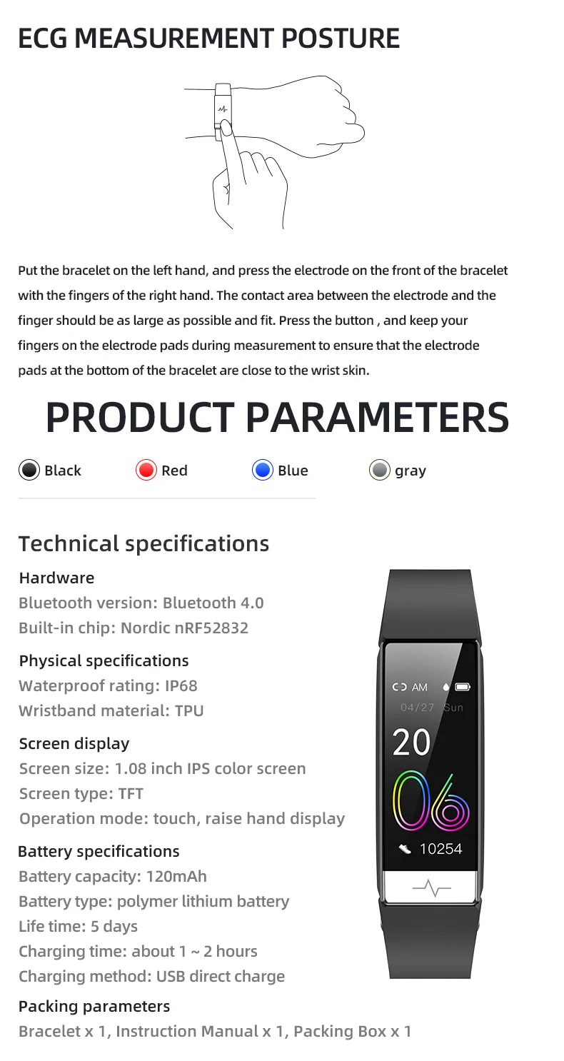 Характеристика: 1. Браслет с отслеживанием показателей здоровья: Смарт-браслет с отслеживанием показателей здоровья имеет функции 24-часовой непрерывный сердечный ритм, мониторинг, измерение показателей ЭКГ, вариабельности сердечного ритма мониторинга и анализа и всеобъемлющих интеллигентая (ый) медицинского осмотра для того, чтобы удовлетворить потребности в повседневной жизни/экстремальных видов спорта. 2. Интеллектуальный спортивный подсчет шагов: Длительное нажатие на беговой интерфейс, чтобы активировать спортивный режим, не только может записывать и сохранять карты в реальном времени, частоту сердечных сокращений, шаги, пробег и калории, но также можно рисовать беговые дорожки. 3. Водонепроницаемость IP68: на основе водонепроницаемого стандарта IP68 Смарт-часы могут отвечать ежедневной защите душей холодной воды, плавания, пота, мытья рук и т. д. (Примечание: не для купания в горячей воде, дайвинг и другие сцены). 4. Несколько функций: умный Браслет поддерживает напоминание о сообщениях, вибрацию вызова и отказ, который совместим с десятками глобальных инструментов мгновенного чата и поддерживает Многоязычное переключение. 5. Несколько спортивных режимов: Смарт-браслет поддерживает несколько спортивных режимов, таких как: открытый бег, Крытый бег, уличная ходьба, внутренняя ходьба, Пешие прогулки, Велоспорт и гребля. Модель: умный Браслет Y91 Основной чип: для скандинавских nRF52832 Вход: 5V-100MA Режим управления: сенсорный, ручной дисплей Вибрация: напоминание о вибрации в режиме реального времени (состояние соединения без Bluetooth) Размер экрана: 1,08 IPS цветной экран 135*240 Тип экрана: TFT Память: 64 КБ RAM и 512кб ROM 64M flash Подключение данных: Синхронизация Bluetooth с низким энергопотреблением 4,0 Совместимая система: для Android 4,4 и выше; Для IOS 9,0 и выше Водонепроницаемый и пылезащитный: IP68 Хранение данных: локальные и облачные сервера Тип батареи: полимерная литиевая батарея Емкость аккумулятора: 120 мАч Срок службы: 4 дня Метод зарядки: Прямая зарядка через USB Время зарядки: около 1 ~ 2 часов Основной материал корпуса: абс + ПММА Материал ремешка: ТПУ Язык приложения: поддержка 12 языков, включая китайский, традиционный китайский, английский, японский, корейский, немецкий, русский, испанский, итальянский, французский, вьетнамский и португальский. Мульти-спорт: уличная бег, уличная ходьба, Крытый бег, крытая ходьба, Пешие прогулки, Шаговая машина, уличная езда, крытая езда, эллиптическая машина, гребная машина
