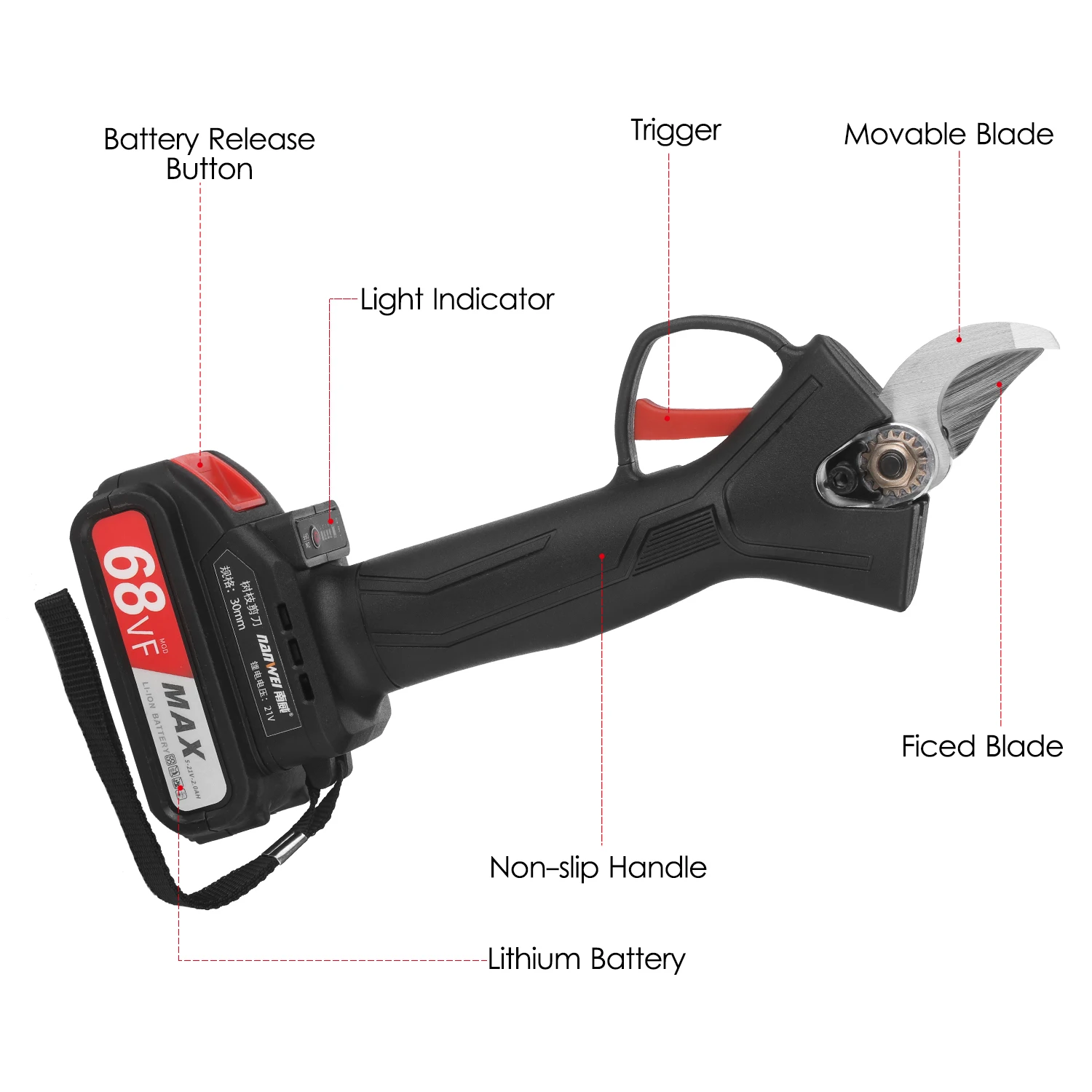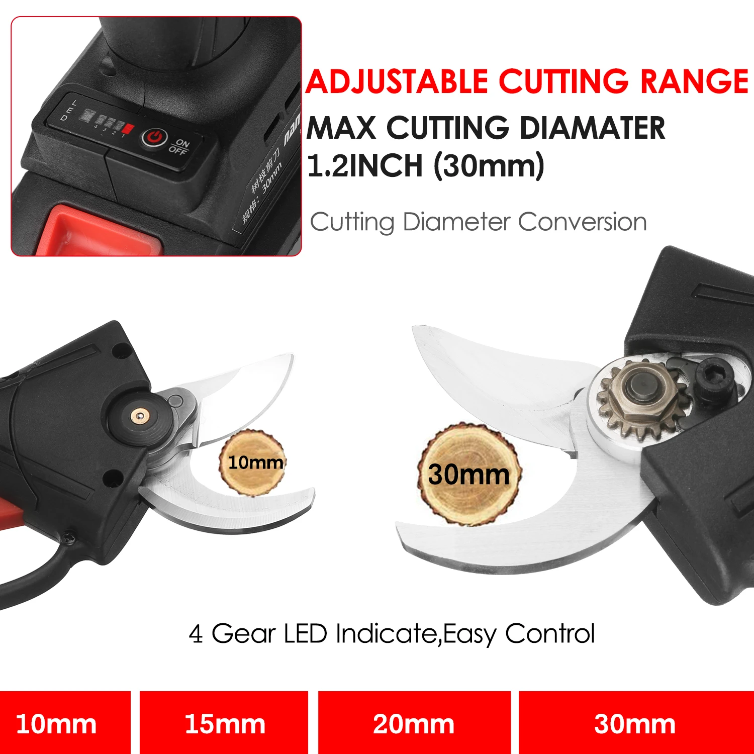 Острое лезвие и регулируемый диаметр резки-бесщеточный секатор ветки дерева принимает лезвия из высокоуглеродистой стали SK5, он чрезвычайно острый и прочный, которые могут обеспечить быструю очистку и ровную обрезку и не повредить ветви. Светодиодный индикатор в боты для 4 вида диаметр среза, и максимум 1,2 дюймов/30 мм диаметр.