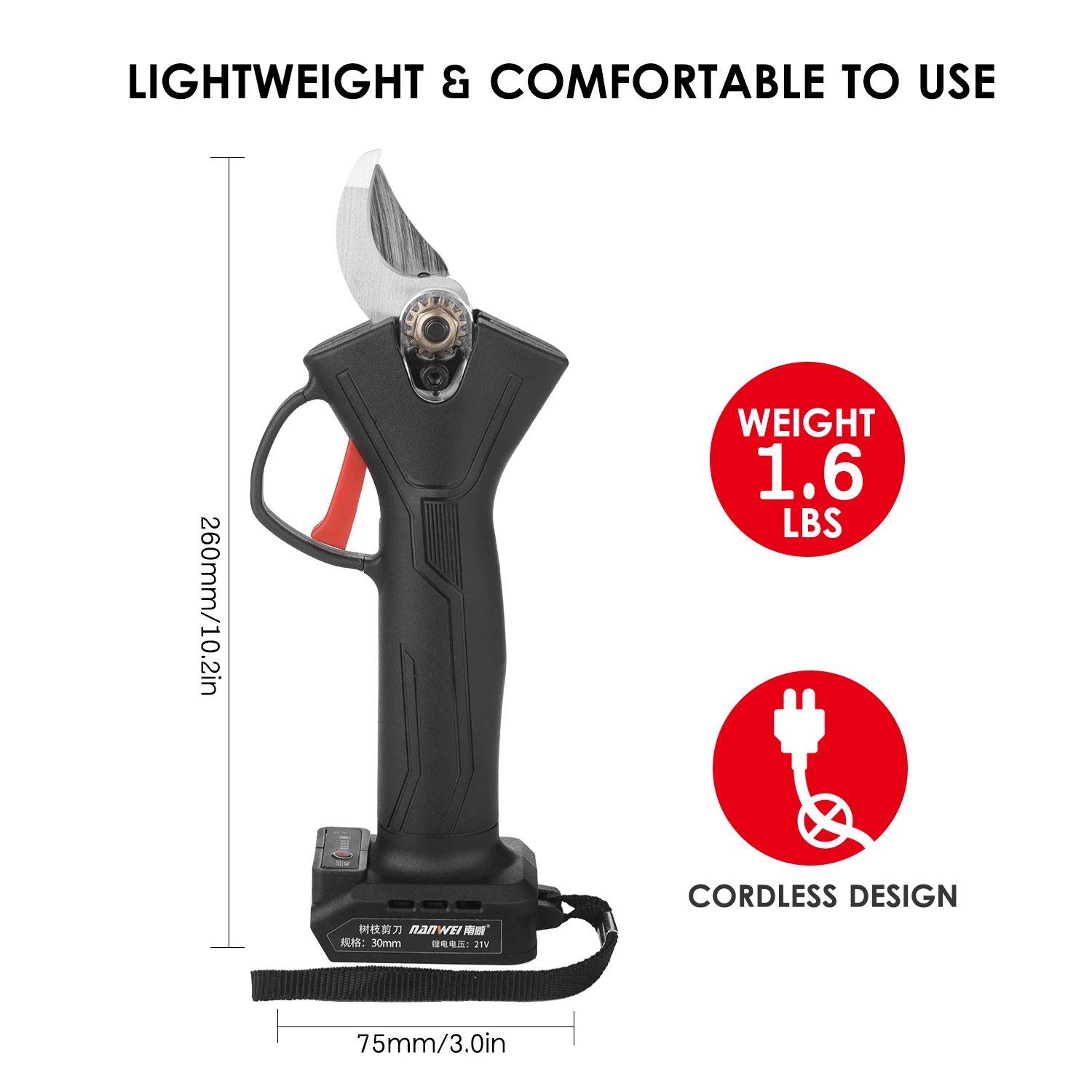 Портативный и легкий-эргономичный и беспроводной дизайн прекрасно подходит для рук, без ручного фаитга после длительного использования и без шнура. Только 1.6 фунтов Легкий и компактный дизайн корпуса идеально подходит для слабых рук, что делает вашу обрезку более легкой и приятной для работы в саду.