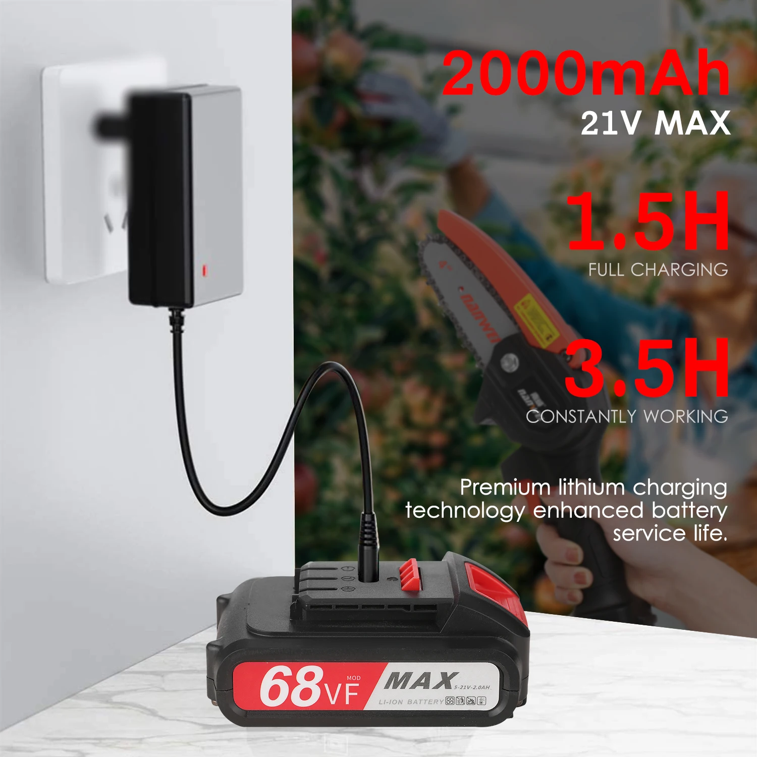 21V 2000 мА/ч, большая емкость литиевая батарея, 1-1,5 время перезарядки может обеспечить 4-5 часов время работы, а также поставляется с 1 шт. сменный аккумулятор.