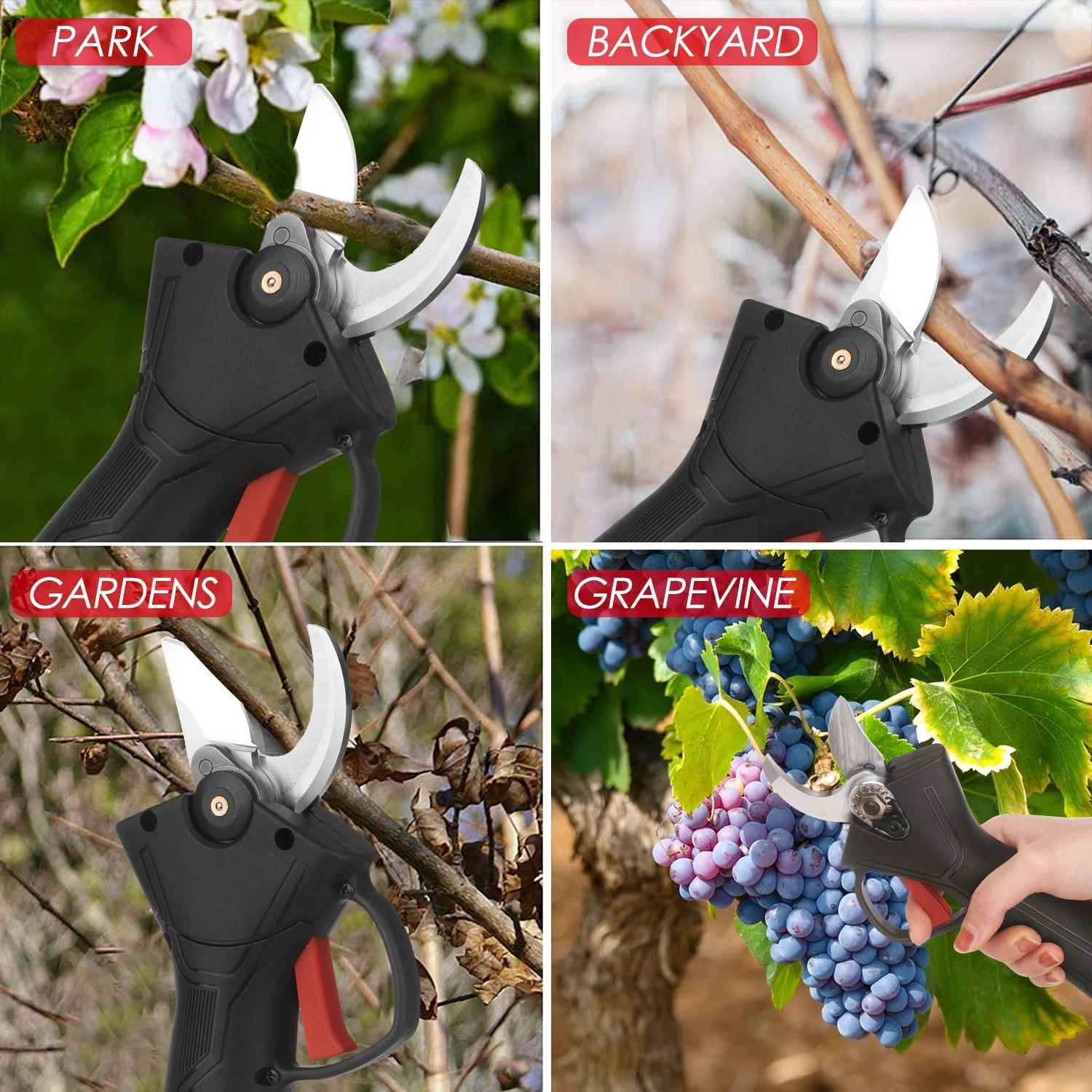 Широкое применение-этот Электрический секатор имеет широкий спектр применений, может использоваться для всех видов садов, парков, ферм, больших пастбищ, садов, теплиц, можно резать виноград, вишневые деревья, яблони и так далее.