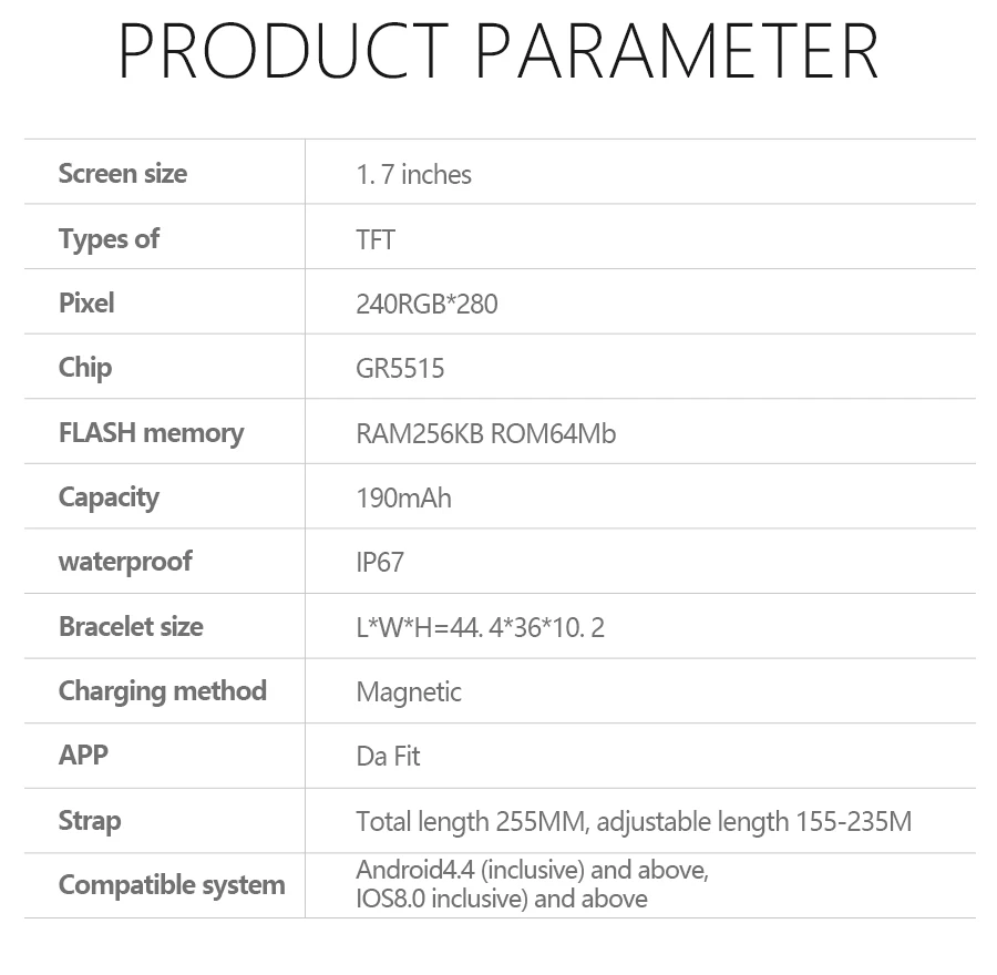 Specification: APP: Dafit Waterproof rating: IP 67 Display: 1.69 inch screen 240*280 Strap material: silicone /steel Operating mode: full touch Battery: 190mAh battery App Timed Class Reminder: Silent Alarm Clock / Sedentary Reminder/Drink Remind/Meeting/Remind Power saving screen saver: lift the wrist brighten screen Standby duration: 10-20 days of maximum standby time, 5-7 days of normal use time;Frequent use: 1-3 days Heart rate detection: exercise real-time heart rate detection / Continuous HR Monitor Settings: stopwatch function, Find phones, dial switch Support system: For iOS 8.0 and above, Android 4.4 and above Watch Languages: English, Chinese, Japanese, Korean, German, French, Spanish, Arabic, Russian, Traditional, Ukrainian, Italian, Portuguese, Thai APP language:Danish, Ukrainian, Russian, Bulgarian, Bokmal, Norwegian, Hindi, Indonesian, German, Italian, Czech, Japanese, Pashto, French, Polish Chinese, Thai, Swedish, Simplified Chinese, Traditional Chinese, Finnish, English, Dutch, Portuguese, Spanish, Vietnamese, Arabic, Korean List: 1* watch 1* manual 1* box APP Features: Custom screen saver, alarm clock, remote capture, sport track, More reminders, etc.. Note:The color of the watch is slightly different from the color of the picture, everything is subject to the actual product