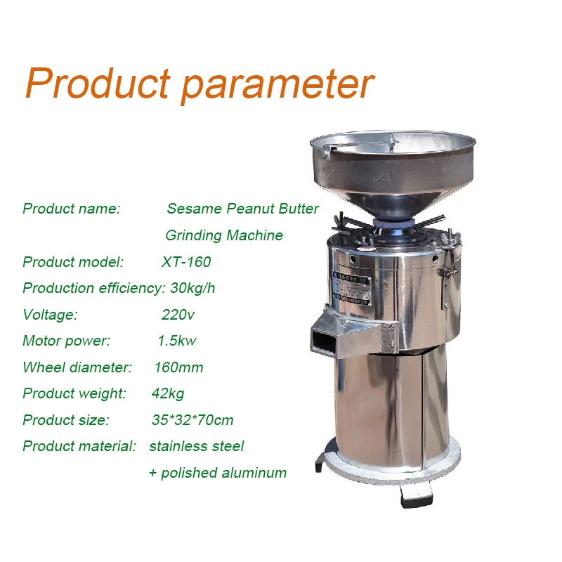 Название продукта: кунжут арахисовое масло шлифовальный станок Модель изделия: XT-160 Эффективность производства: 30 кг/ч Напряжение: 220 В Мощность двигателя: 1,5 кВт Диаметр колеса: 160 мм Вес изделия: 42 кг Размер изделия: 35*32*70 см Материал изделия: нержавеющая сталь + полированный алюминий