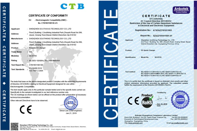 Сертификаты зарядного устройства EV: Наше зарядное устройство сСертификат CE. КабельПрошел тест TUV, Гарантируем высокое качество.Все наши продукты проходят строгие проверки перед отправкой с завода. Материал соединителя-термопластичный, японский PA66 + 30% стекловолокно.Металлическая часть-медь + серебряное покрытие. Очень хорошая электропроводность и не легко нагреваться.