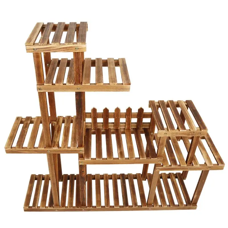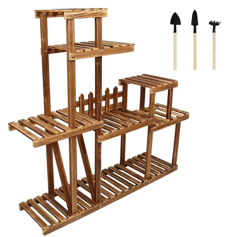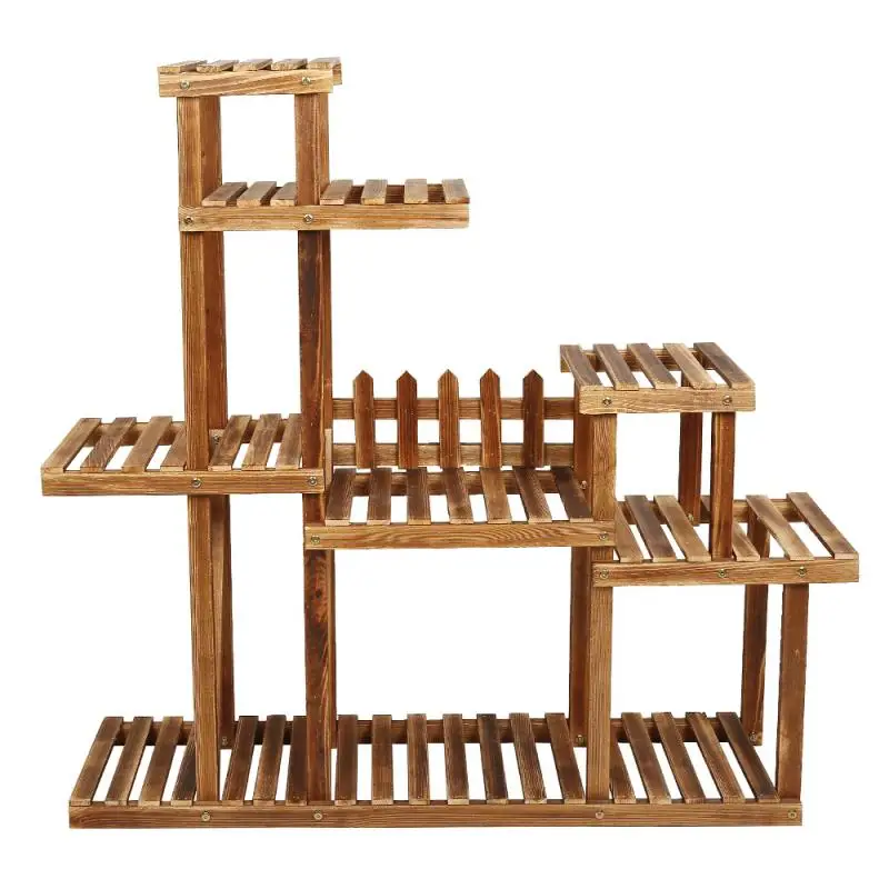 1. Сосновая древесина карбонизируется при высокой температуре 300 градусов, что улучшает устойчивость к деформации; Вы можете полагаться на ее водонепроницаемые и антикоррозийные функции. Подставка для растений с прочной рамой может поддерживать 10 кг на каждой полке.