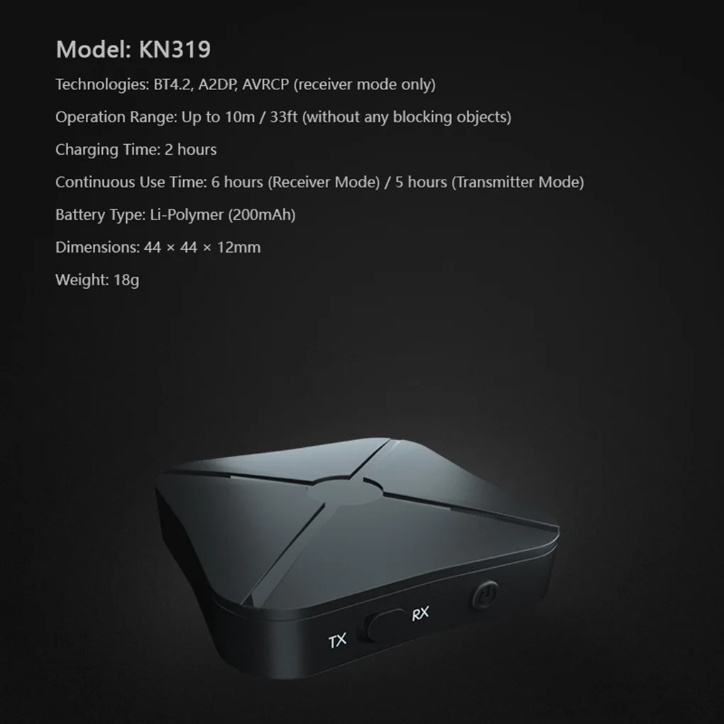 Переключение между режимами передатчика и приемника одним нажатием кнопки. Легко подключить используя передовые технологии Bluetooth-Совместимость с операционными технологии и 3,5 мм аудио кабель (все указанные аккумуляторы входят в комплект поставки).