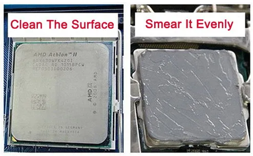 3. Тепловая паста должна быть равномерно размазана на всей поверхности процессора. Он не может быть слишком тонким, напечатанные на нем слова должны быть покрыты. Не слишком толстая, толщина, как бумага формата А4, будет лучше. Пожалуйста, обратитесь к следующим фотографиям.