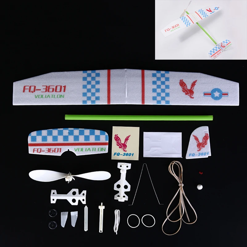 Резиновый самолет, который поднимается пропеллером с помощью энергии упругости. В то время как сила эластичности заканчивается, модель будет снижаться.