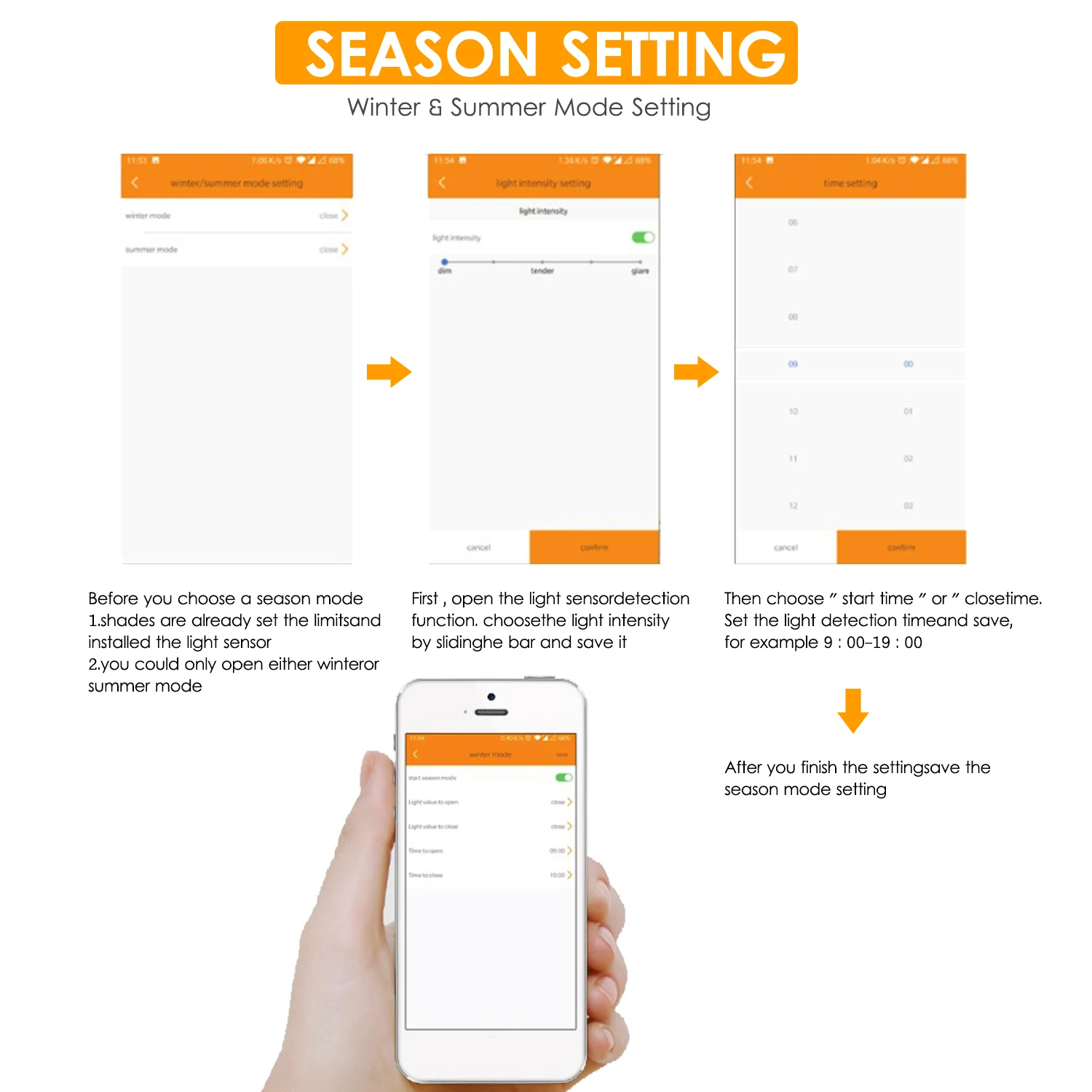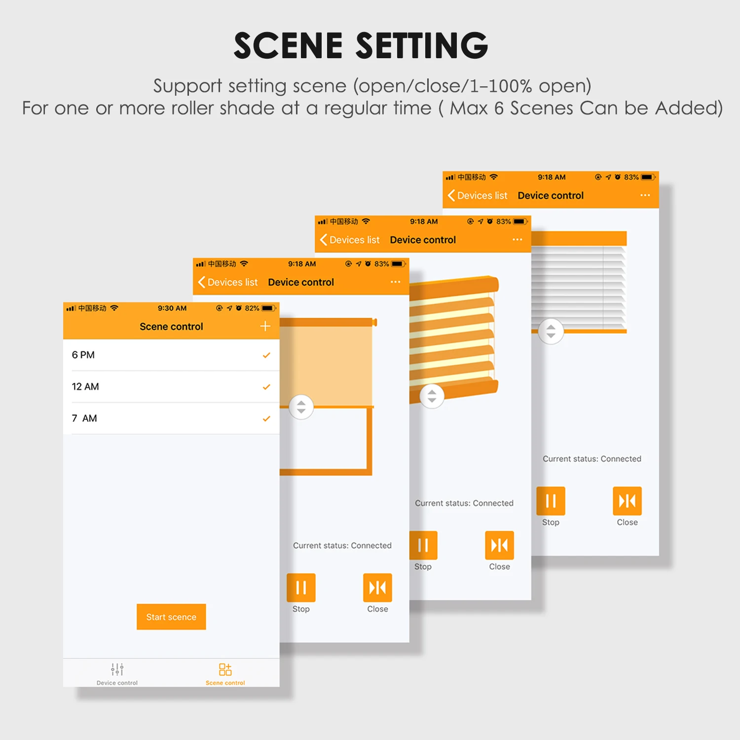 Настройка графиков-настройка времени открытия и закрытия, как вам нравится, например, открыть, когда солнце risem и закрыть, когда закат, и т. Д. Время + день + неделя программируемые, более гибкие настройки в соответствии с вашими требованиями. Макс. 6 настроек сцен могут быть добавлены. Он также поддерживает летний и зимний режим.