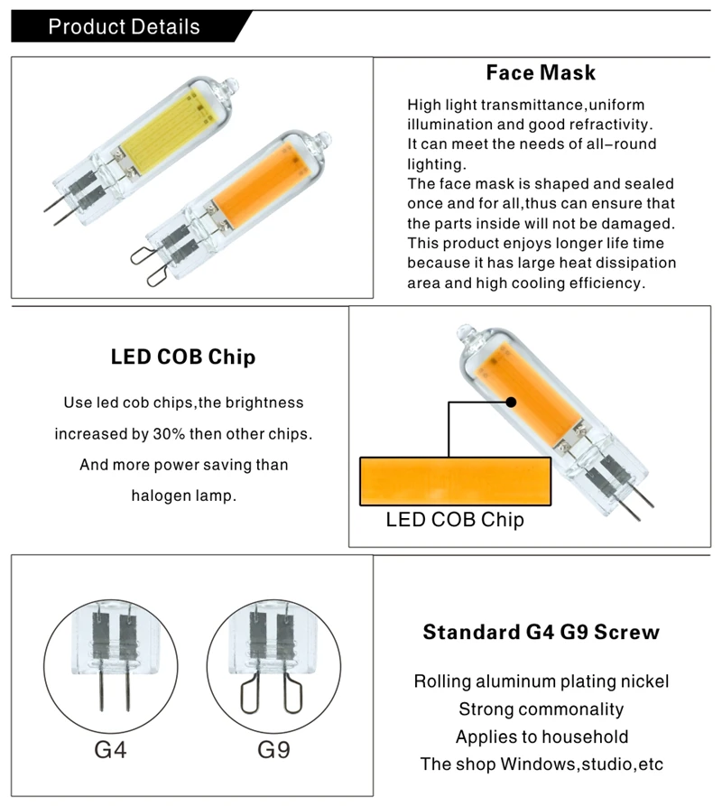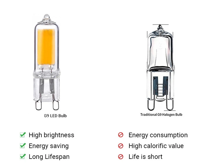 Экономит более 90% на счетах с электричеством. Сверхдлительный срок службы до 50000 часов. Тщательно решите вашу проблему частой замены лампочек. Основание G9 международного стандарта, подходит для всех светильников G9. Экологически безвредный, без токсичных веществ, без ртути, без УФ-излучения или инфракрасного излучения. Более защищает ваши глаза.