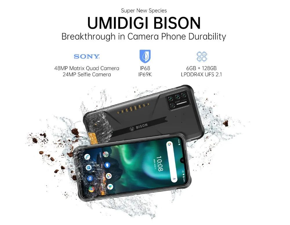 UMIDIGI BISON поставляется с оценками IP68 и IP69K и достаточно прочна, чтобы выдерживать суровые погодные условия. IP68 означает, что она Водонепроницаемость до 1,5 метров воды до 30 минут и защищен от пыли, грязи и песка. IP69K позволяет телефону выдерживать испытание паровой мойки therma, выдерживает высокое давление воды 100 бар (1450 psi) и высокую температуру воды 80