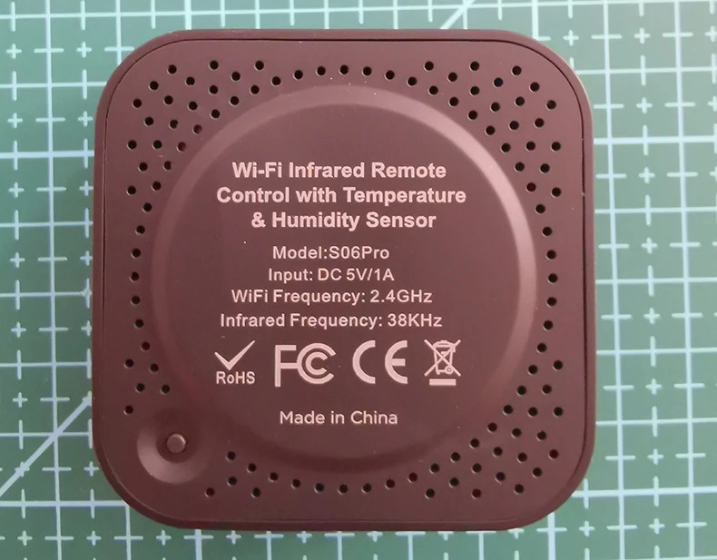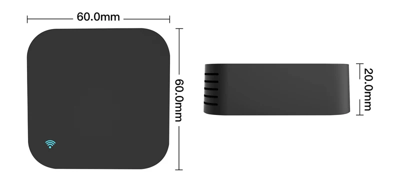 * Вход: DC 5V/1A(Micro USB не адаптер стандарта Австралии) • частота инфракрасного сигнала: 38 кГц * IR пульт дистанционного управления Управление расстояние: 10 м • Подключение: Wi-Fi 2,4 ГГц • приложение: tuyaSmart или Smart Life * Диапазон измерения температуры: 0 ℃-80 ℃ * Точность температуры: ± 1 ℃ * Диапазон измерения влажности: 0% RH-99 % RH * Точность влажности: ± 5% RH * Материал: ABS * Размер: 60*60*20 мм