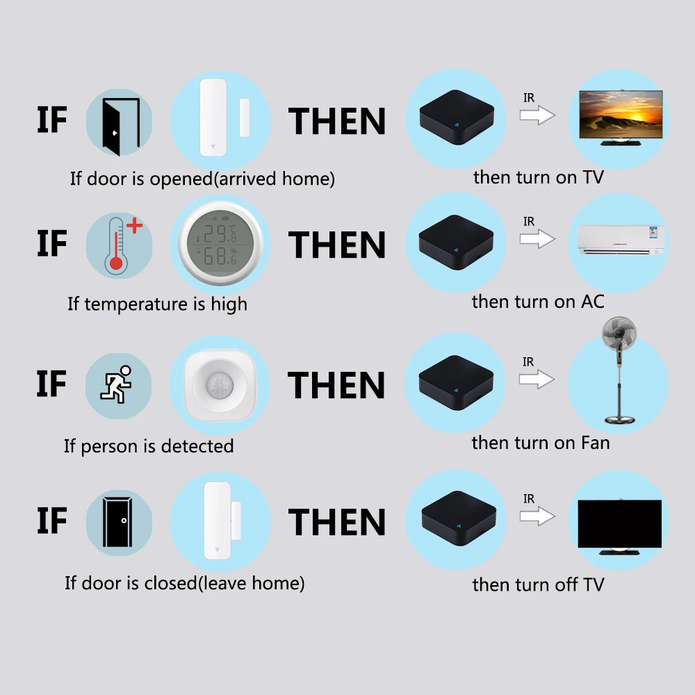 Создавая «автоматизацию» в приложении и взаимодействуя с другими устройствами Tuya smart home, универсальный пульт дистанционного управления может выполнять действия автоматически в соответствии с такими условиями, как состояние устройства, погода и время. Обратите внимание: дверной датчик, датчик температуры и датчик движения не включены в посылка.