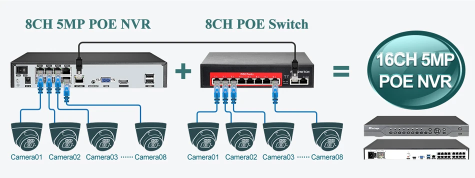 2. Он может быть расширен до 16 шт. 5 Мп POE камера при использовании 8CH POE коммутатор вместе.