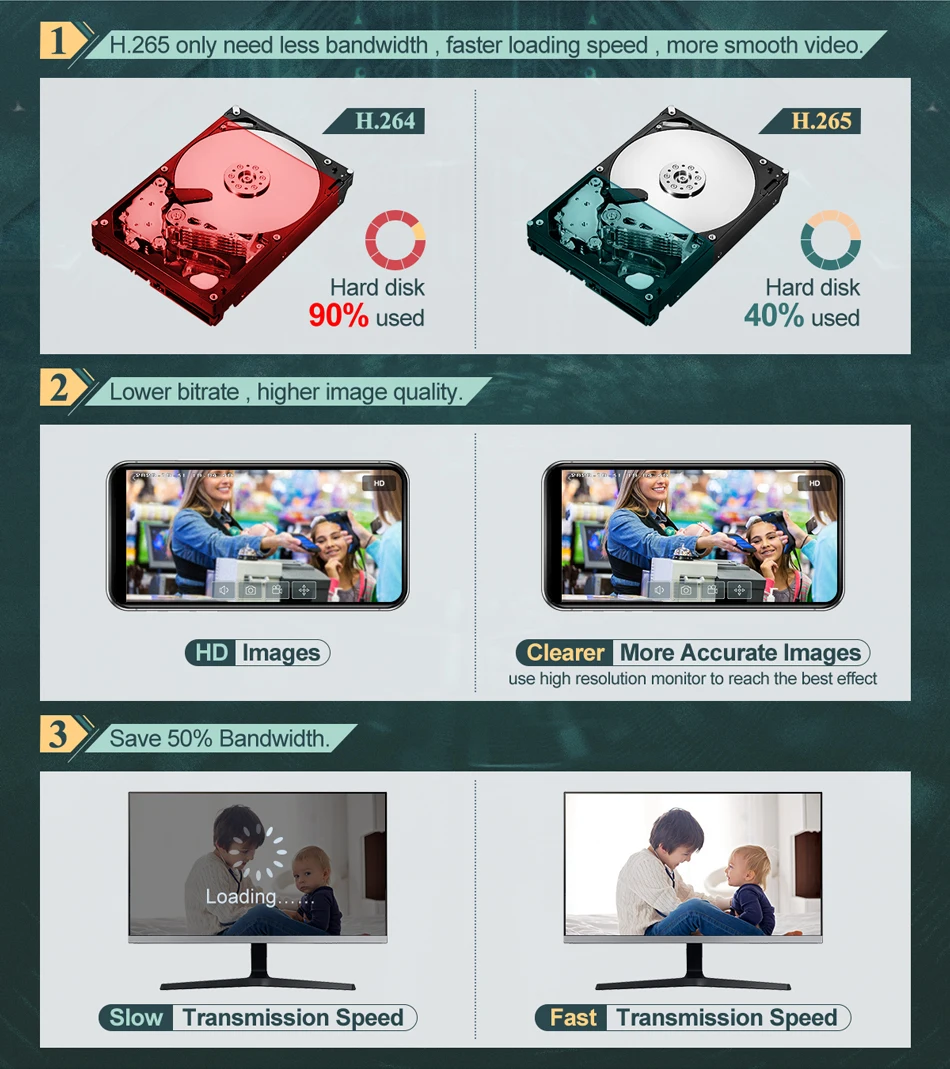H.265 требует только более низкой полосы пропускания, скорость загрузки быстрее, воспроизведение видео более плавно.