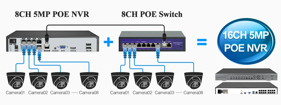 Он может быть расширен до 16 шт. 5 Мп POE камера при использовании 8CH POE коммутатор вместе