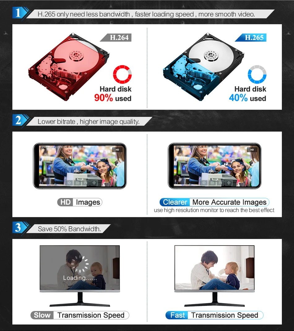 H.265 более четкий, HD разрешение предлагает вам лучшее качество изображения в более низкой скорости.