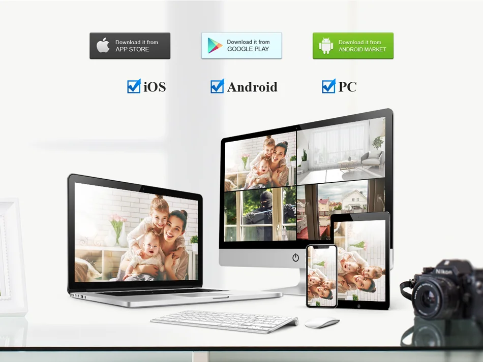 На основе технологии P2P (peer to peer), поддержка установки plug-and-play. Доступ к ip-камере через веб-интерфейс через Интернет-проводник, также поставляется с бесплатным приложением для смартфонов (Android и iPhone) для удаленного просмотра из любого места.