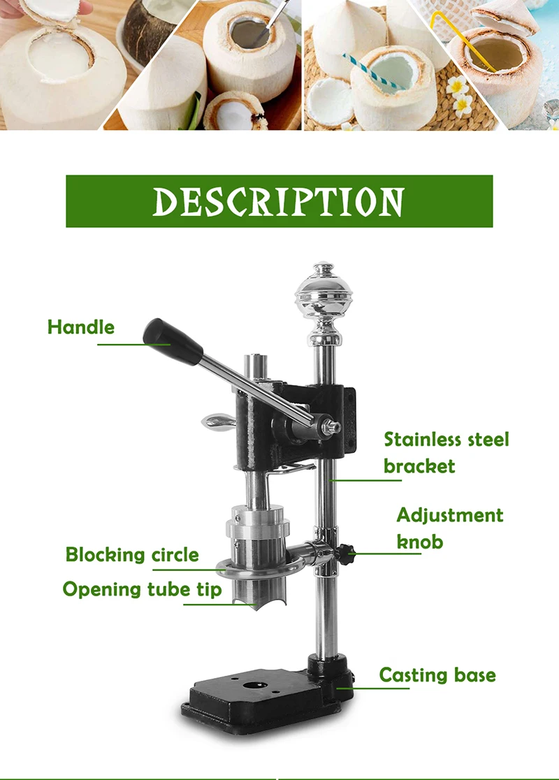 Название: машина для открытия зеленого кокосового ореха Модель: IT-C02-1 Вес нетто: 6,5 кг Вес брутто: 7,5 кг Размер отверстия из нержавеющей стали: 6 см Размер машины: длина 20,5 см * ширина 12 см * высота 56 см