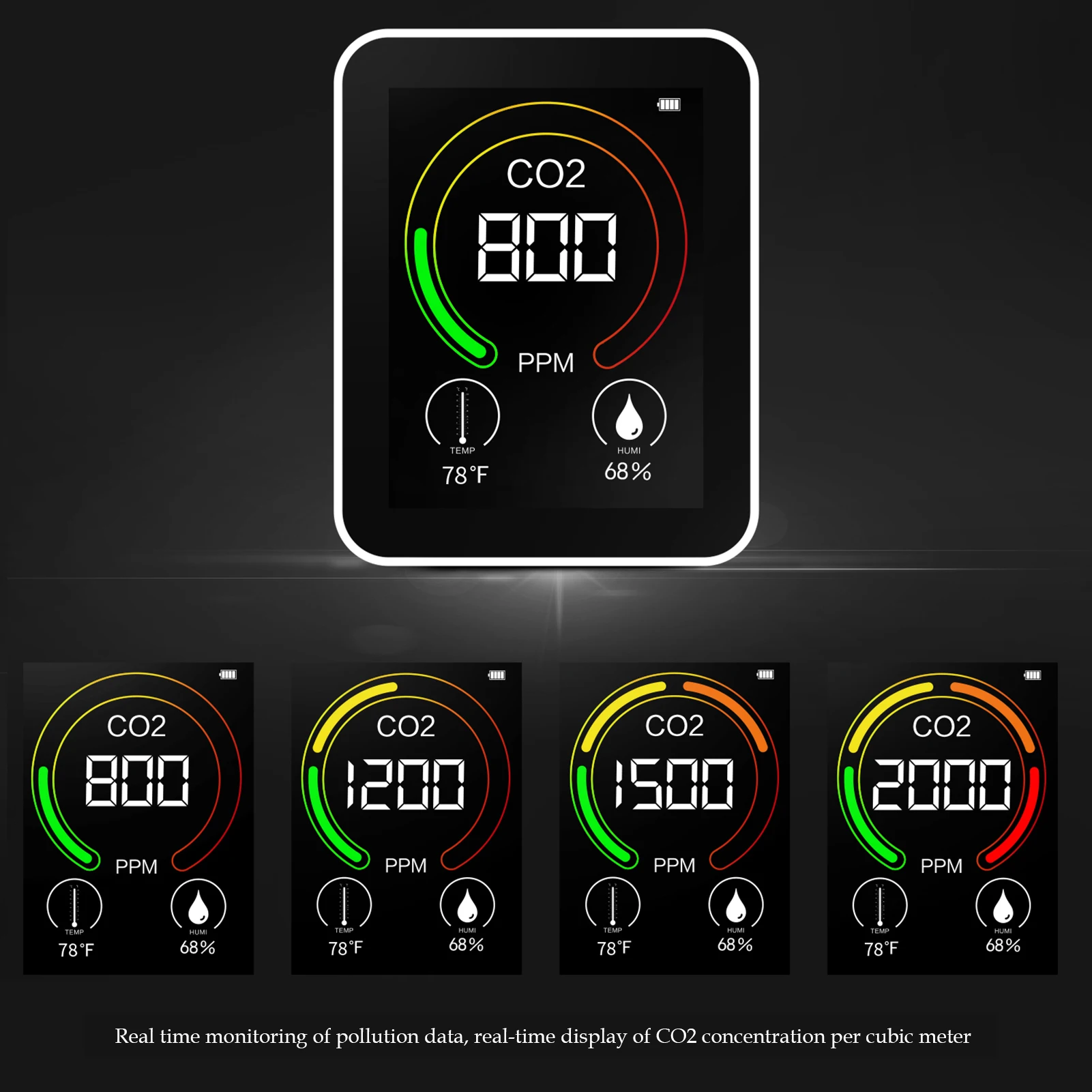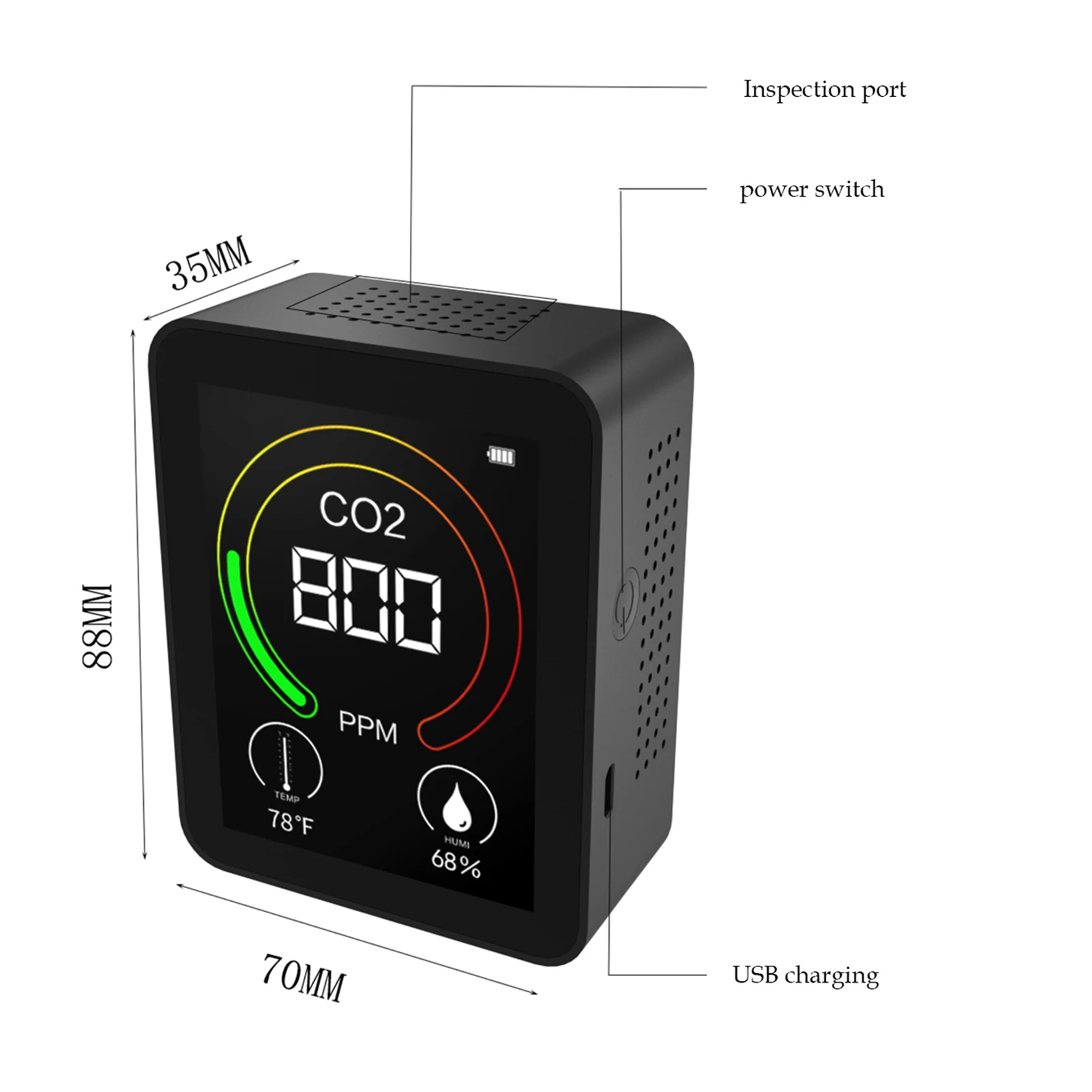 Особенности:1. Практические функции: 3 функции обнаружения концентрации углекислого газа, термометра и гигрометра в одном.2. Простая операция s: это простая операция, которую вы можете долго нажимать кнопку ВКЛ-ВЫКЛ на правой стороне в течение 3 секунд для включения и выключения. Нет необходимости калибровать после запуска, работы и обнаружения автоматически.3. Длительный срок службы батареи: Встроенный литиевый аккумулятор 1200 мАч, usb-шнур питания.4. Детектор CO2: он отображает текущие данные о CO2, а также данные о температуре и влажности, цветное кольцо изменится в соответствии с содержанием CO2.5. Многоцелевое Применение: качество воздуха монитор оснащен 2,5 дюймовый цветной экран, это компактный и портативный, который может быть помещен в кухня, ванная комната, гостиная, рабочий стол, журнальный столик, и других средах.Характеристики:Диапазон обнаружения CO2: 400-5000PPMЧувствительность обнаружения CO2: 1ppmДиапазон обнаружения TVOC: 0-2ppmИзмерение температуры: 0 ~ 50 °CИзмерение температуры: ± 1 °CДиапазон измерения влажности: 0% ~ 99% RHТочность измерения влажности: ± 2% относительной влажностиРежим зарядки: DC5V 500mA micro USB интерфейсАккумулятор: встроенный литиевый аккумулятор 1200 мАчРазмеры: около 9*7*3 см/3,54*2,75*1,18 дюймовЭкран: около 2,75 дюймовМертвый Вес: около 150 гИнструкции:1. Нажмите и удерживайте кнопку питания справа в течение 3 секунд, чтобы включить и выключить, затем он отобразит текущие параметры качества воздуха2. Детектор CO2. Он отображает текущие данные о CO2, а также данные о температуре и влажности, цветное кольцо изменится в соответствии с содержанием Co23. Это простая операция, которую вы можете долго нажимать кнопку ВКЛ-ВЫКЛ на правой стороне в течение 3 секунд, чтобы включить и выключить4. USB может быть заряжен путем подключения к источнику питания 5 В. Значок батареи мигает в состоянии зарядки, и он останавливается, когда он заполнен. Если дисплей полный, но все еще мигает, это означает, что зарядка не насыщена. Пожалуйста, подождите некоторое времяУпаковочный лист:1 хост1 х USB кабель для зарядки1 х РуководствоТолько вышеуказанное содержание упаковки, другие продукты не включены.Примечания:1. Ввиду различий между операторская техника, светильник интенсивности и экраны дисплея фактический цвет товара может незначительно отличаться цвет предмета может быть s светильник ly отличается от того, что показано на картинке.2. Ввиду того, что Замеры производились вручную, замеры сделаны вручную, поэтому возможны погрешности 0,1-2 см.3. Не используйте его часто в пыльной среде с плохим качеством воздуха, чтобы продлить срок службы.4. Не используйте это устройство при высокой температуре, высокой влажности, грязных или вблизи сильных магнитных полей, чтобы Избежать неточных значений или выхода из строя внутренней цепи.