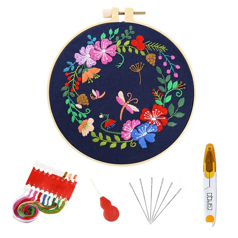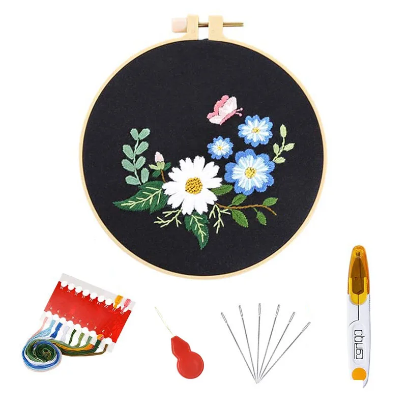Стоимость упаковки: 1 шт. белая хлопковая ткань с цветущими кустарниками, 1 шт. черная хлопковая ткань с ромашками, 1 шт. синяя хлопковая ткань с растительным садовым узором, 3 шт. 7,9 дюйма вышитые обручи, 3 набора мягких нитей для вышивания, 6 игл для вышивания, 1 ножницы, 1 Инструкция