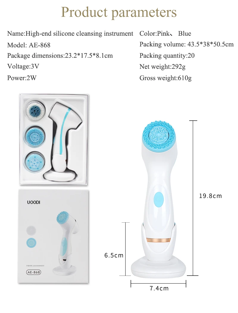 【 3 в 1 дизайн 】поставляется с 3 сменными чистящими насадками, 2 удобными для кожи силиконовыми щетинками для массажа лица и очистки, 1 мягкая и тонкая Щетинная головка Dupont тщательно очищает поры кожи.