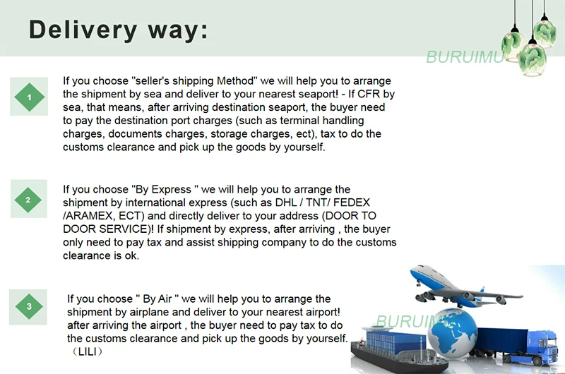 1. Если вы выберете «способ доставки продавца», мы поможем вам организовать доставку по морю и доставить в ближайший морской порт! -Если CFR морем, это означает, что после прибытия морского порта назначения, покупателю необходимо оплатить стоимость порта назначения (например, расходы на обработку терминала, расходы на документы, расходы на хранение и т. Д.), налог, чтобы сделать таможенное оформление и забрать товары самостоятельно. 2. Если вы выберете «экспресс», мы поможем вам организовать доставку международной экспресс-почтой (например, DHL / TNT/ FEDEX /ARAMEX и т. Д.) И непосредственно доставляем по вашему адресу (от двери до двери)! При отправке экспресс-почтой, после прибытия, покупатель должен только оплатить налог и помочь транспортной компании, чтобы сделать таможенное оформление в порядке. 3. Если вы выберете «по воздуху», мы поможем вам организовать доставку самолетом и доставить в ближайший аэропорт! После прибытия в аэропорт, покупатель должен оплатить налог, чтобы сделать таможенное оформление и забрать товары самостоятельно.(LILI)