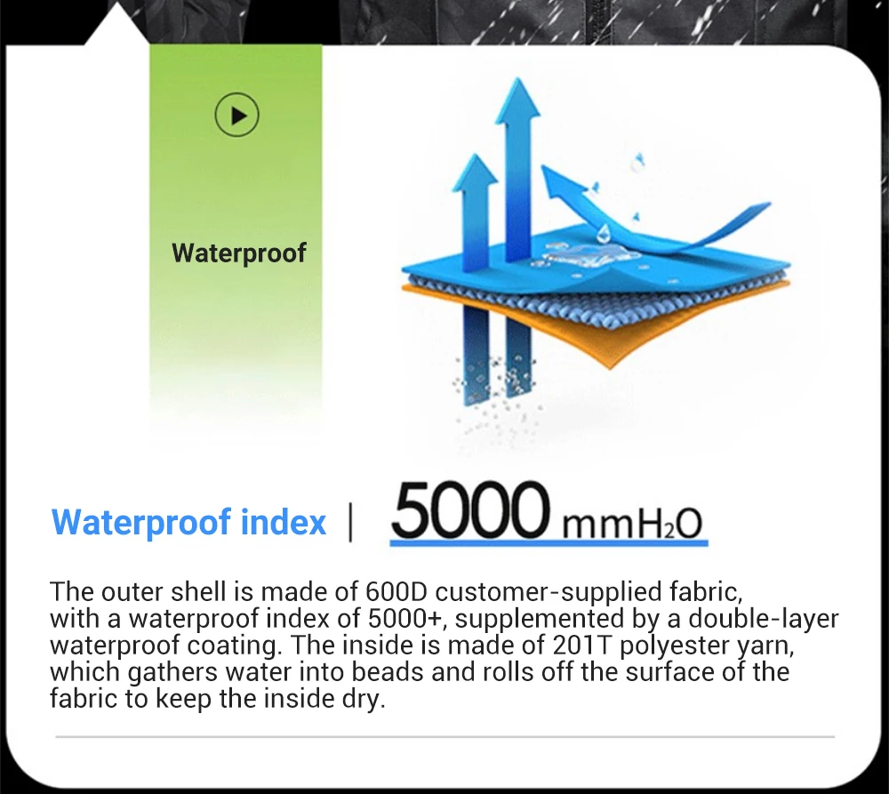 Внешний слой куртки выполнен из ткани стандартного индекса 600D. Дождевая вода соберет Водяные Шарики на поверхности куртки и скатывается с поверхности куртки.