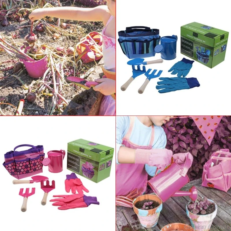 В комплект входят: Сумка-тоут, лопата, грабли, вилка, Лейка для полива, перчатки для детей. Все инструменты сделаны с деревянными ручками и качественными металлическими головками.