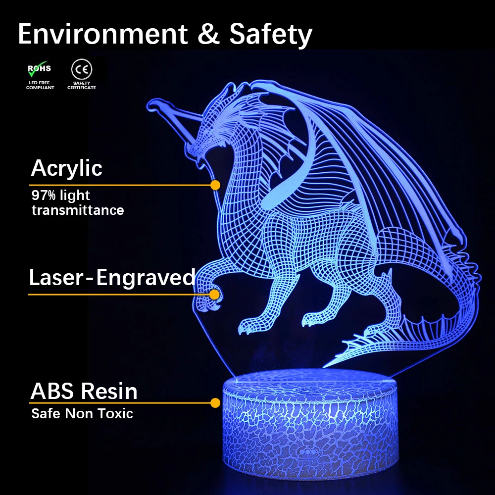 【Креативный 3D визуальный эффект 】3D светодиодный ночной Светильник изготовлен с лазерная гравировка технологии для того, чтобы создать великолепные оптические великолепные 3D Иллюзия с реалистичным 3D в форме животных дизайн. Лазерная гравировка акриловой части толщиной всего 5 мм, но обеспечивает волшебное 3D освещение, удобно и полезно. Более того, динозавр 3D светодиодный светильник имеет 16 меняющихся цветов.