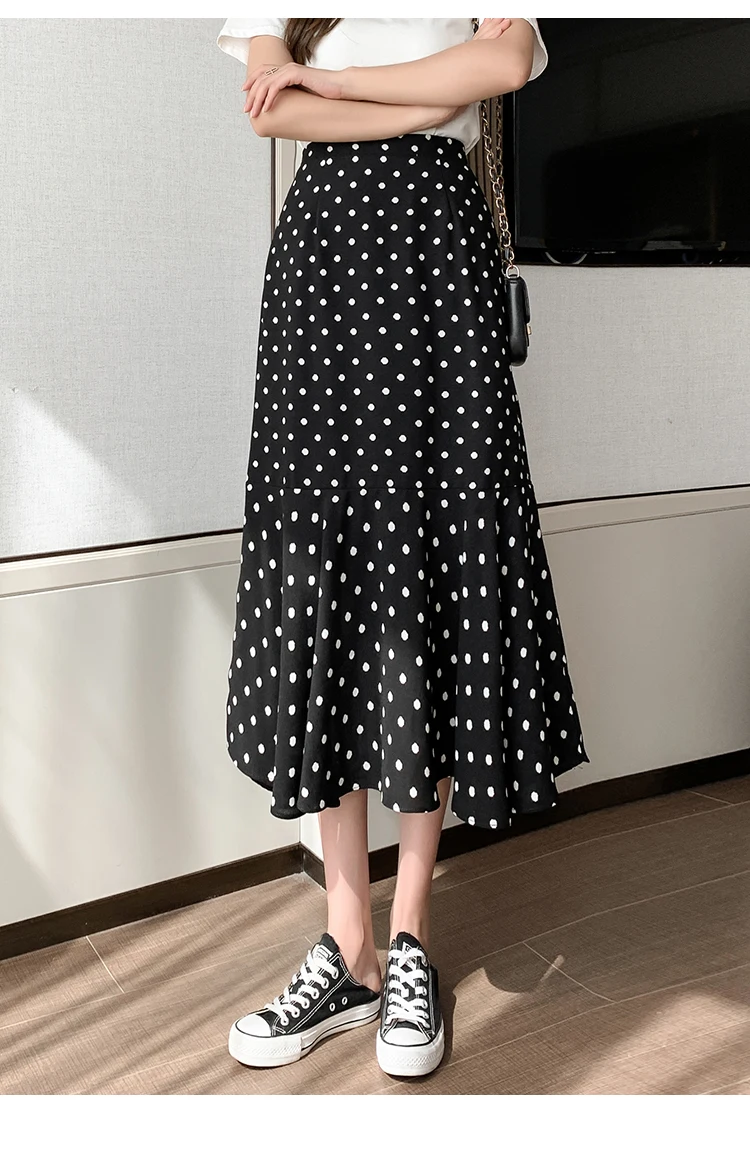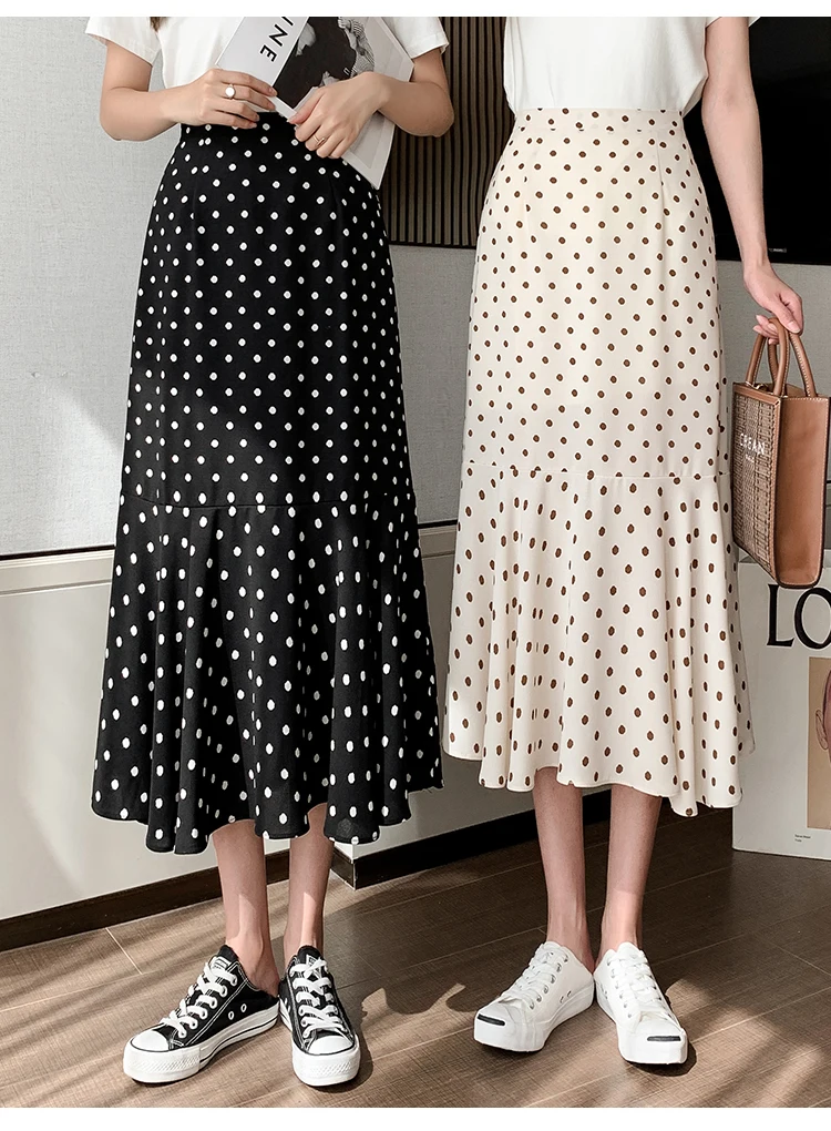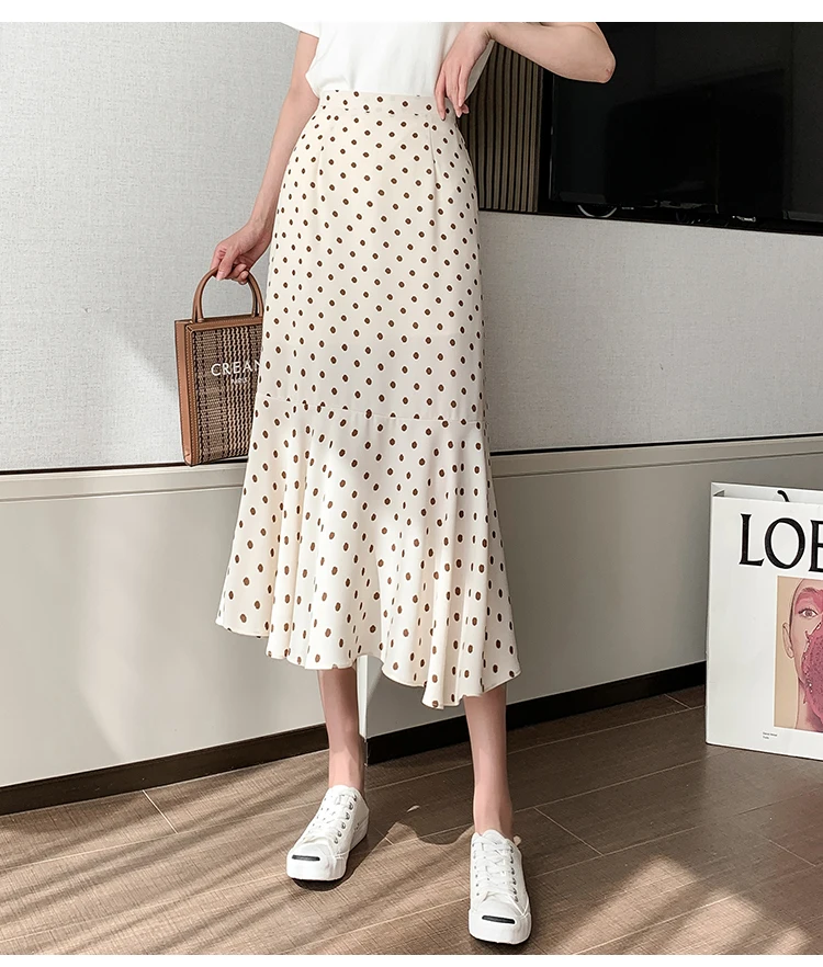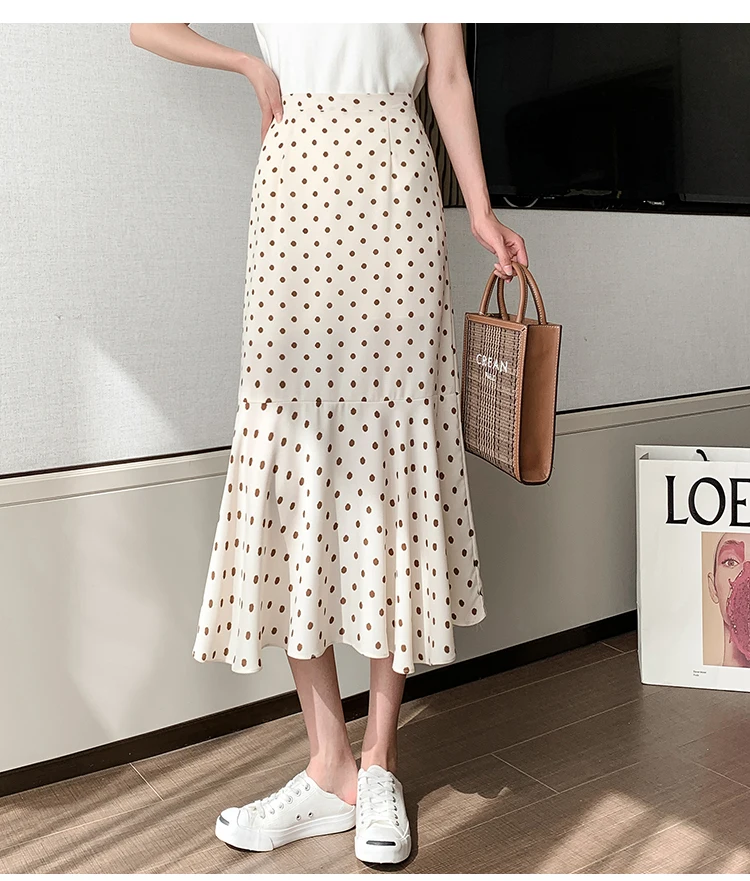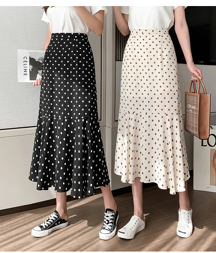 TingYiLi Women's Beige Black Polka Dot Print Mermaid Skirt Summer High Waist Elegant Chiffon Midi Skirt Korean Sexy Tight Skirt