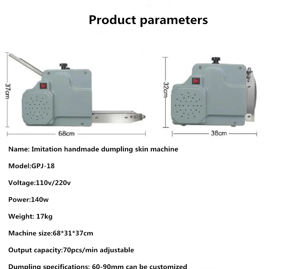 Название: имитация ручной работы клецки машина для кожи Модель: GPJ-18 Напряжение: 110 В/220 В Мощность: 140 Вт Вес: 17 кг Размер машины: 68*31*37 см Выходная мощность: 70 шт/мин регулируемая Характеристики клецки: 60-90 мм могут быть настроены Форма формы: круглая, квадратная, алмазная, овальная, на заказ