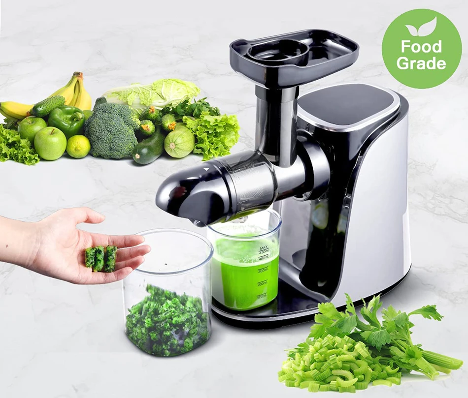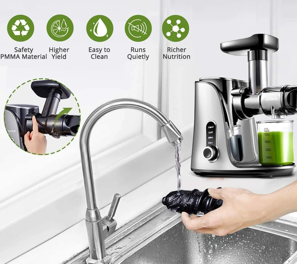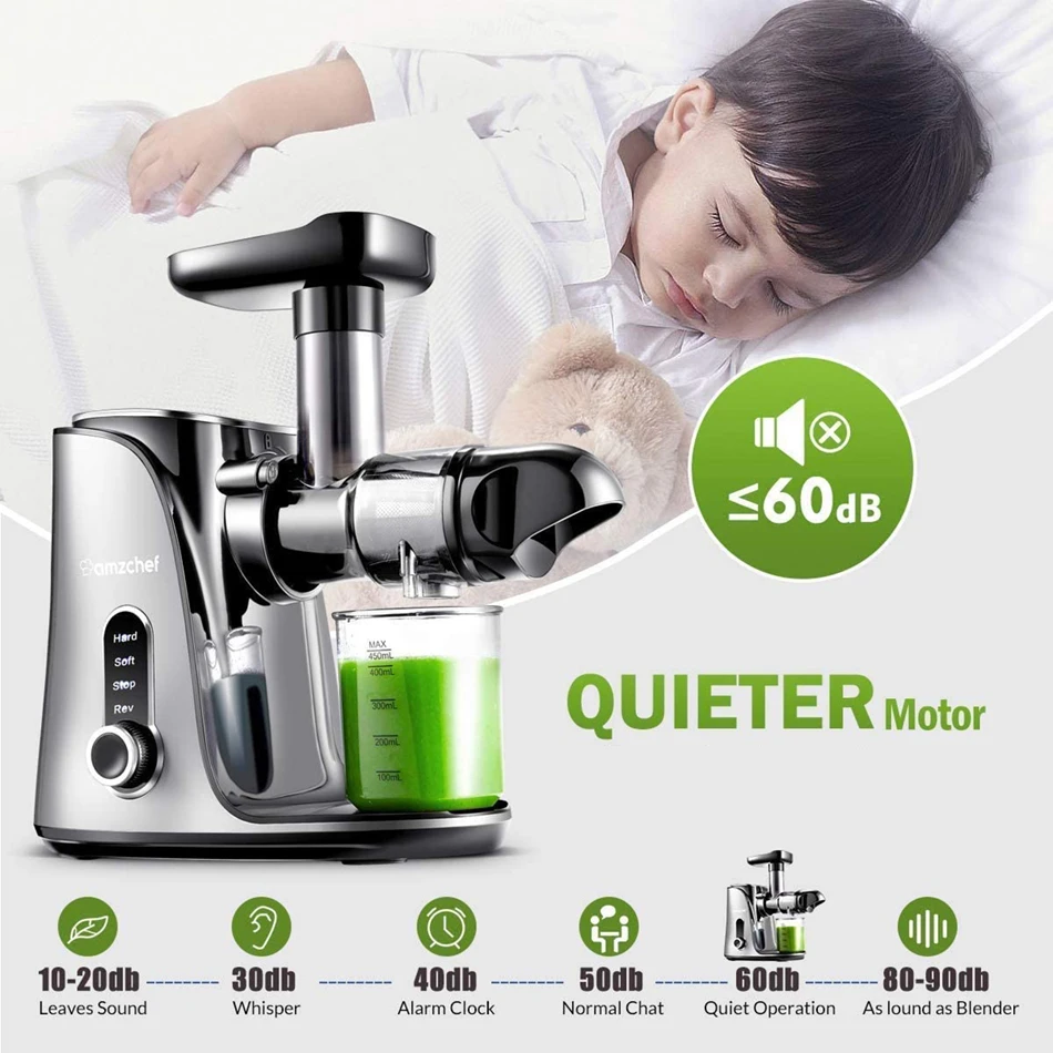 Эта медленная соковыжималка AMZCHEF имеет гибкую конструкцию с 2 скоростями управления для извлечения различных фруктов и овощей (включая листья овощей).