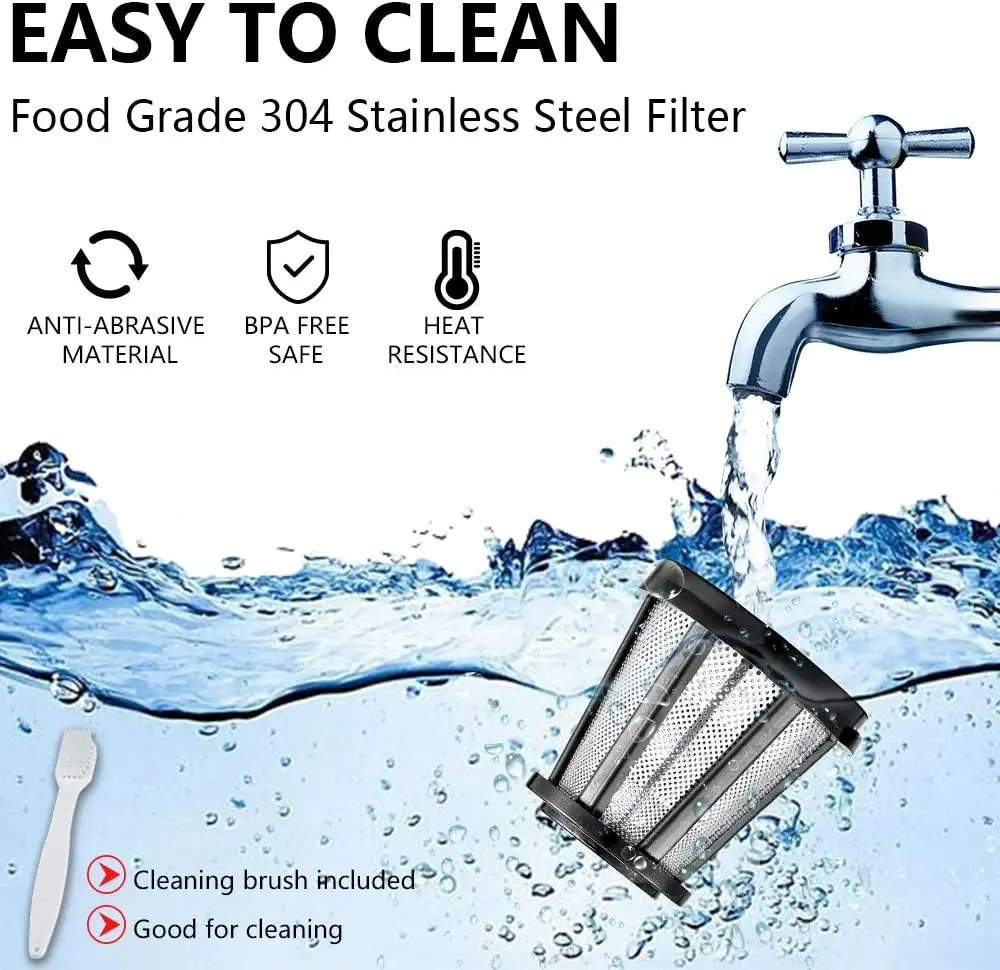 Соковыжималка для холодного пресса оснащена интеллектуальными ЧИПАМИ защиты, что позволяет автоматически останавливаться на каждые 20 минут работы. Медленная соковыжималка имеет обратную функцию, чтобы избежать застревания и помогает вам очистить. Все съемные детали изготовлены из высококачественных антиокислительных материалов для пищевых продуктов (без BPA), легко чистятся с помощью бонусной щетки или могут быть безопасно очищены в посудомоечной машине.