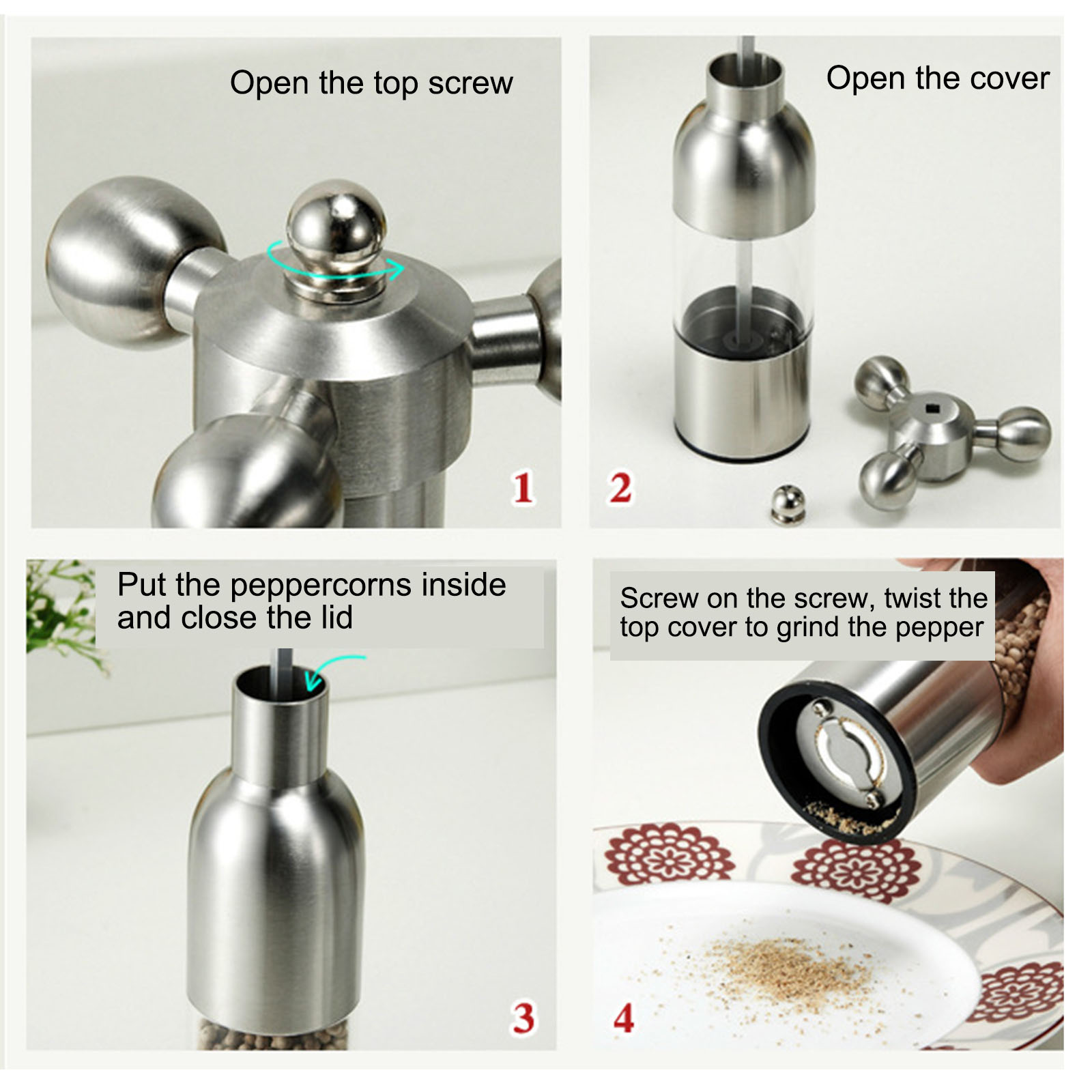 3. Многоразовая шлифовальная машина для перца легко очищает рощи и закрывает крышку на каждом конце, чтобы оставаться в чистоте и предотвратить попадание влаги и пыли, В отличие от других шлифовальных машин с открытым дном, который оставляет соль и перец по всему столу или полке.