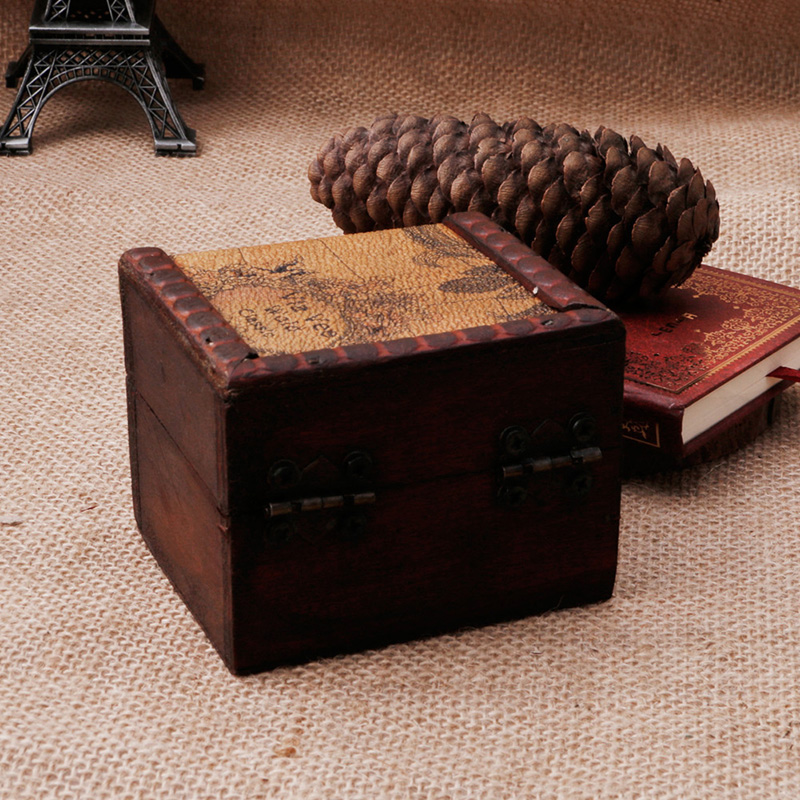 Он сделан из дерева и имеет рисунок старой карты мира, напечатанный на нем, что очень соответствует текущей тенденции. Крышка на петлях и держится на замке металлической застежкой в античном стиле.