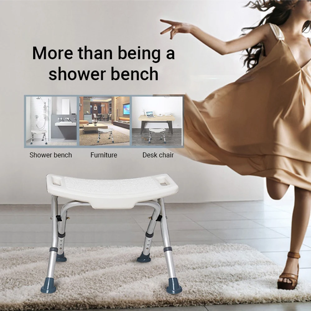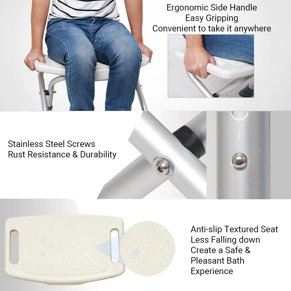 Эта складная душевая скамья имеет раму из коррозионно-стойкого алюминиевого сплава, широкое основание с противоскользящей текстурированной поверхностью, регулировку высоты без инструментов, удобное сидение, примерно до 300 фунтов, подходит для пожилых людей, для инвалидов, беременных женщин, послеоперационных людей с ограниченными возможностями, помогает им безопасно сидеть и принимать душ с меньшим падением во время ванны или душа, Создает безопасную и приятную ванну.